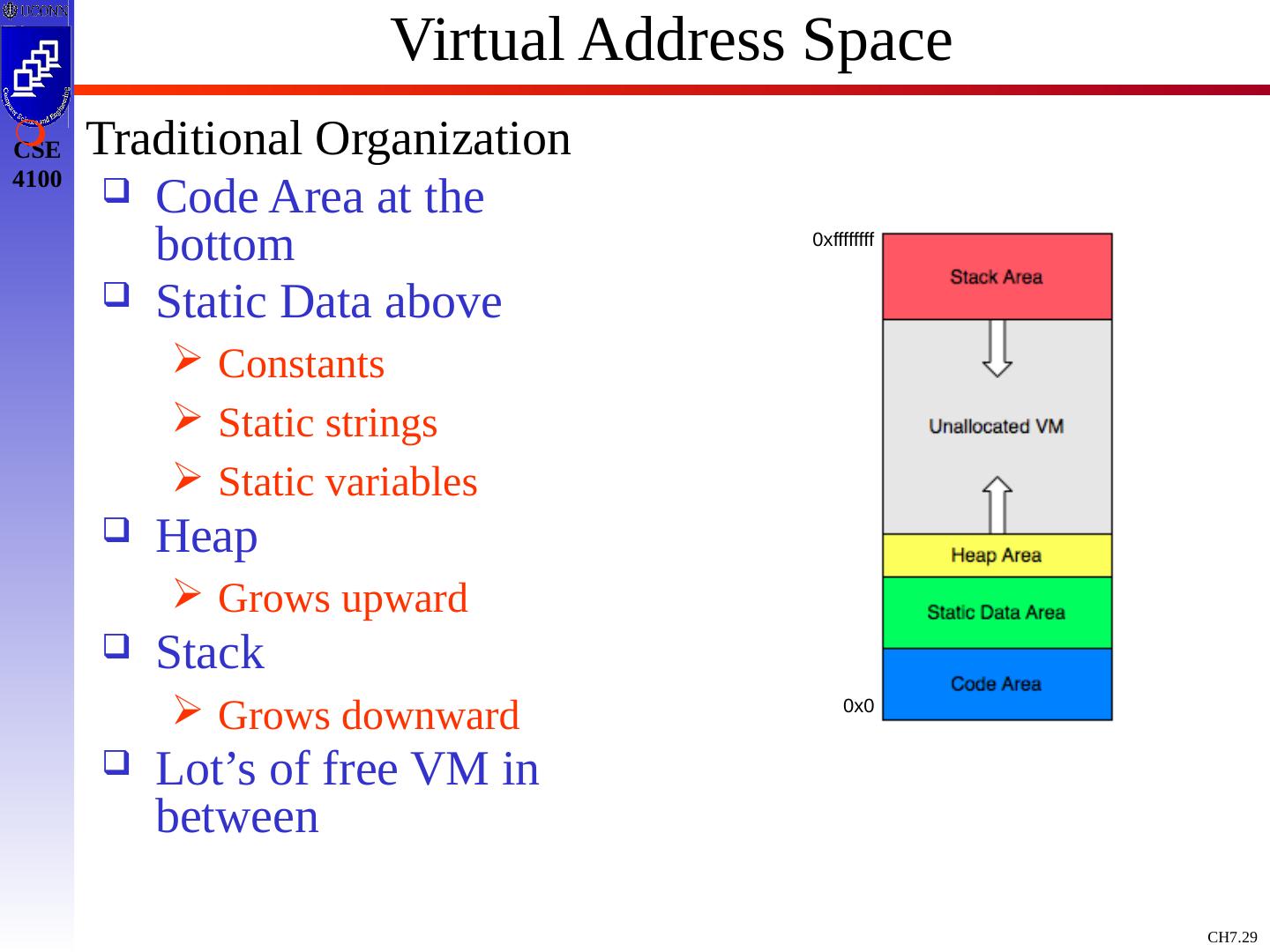 29 .Virtual Address Space Traditional Organization Code Area at the bottom Static Data above Constants Static strings Static variables Heap Grows upward Stack Grows downward Lot’s of free VM in between 0x0 0xffffffff