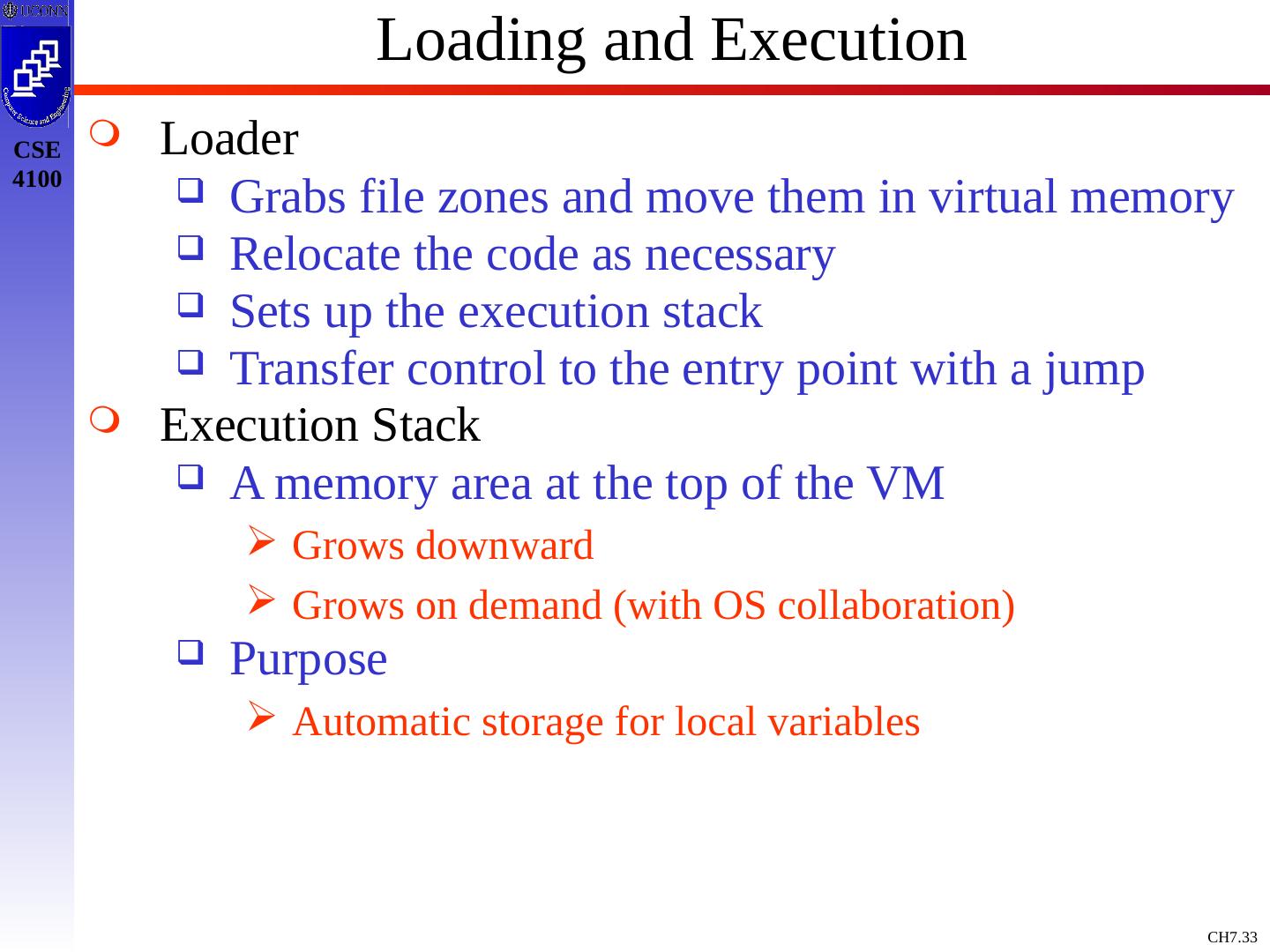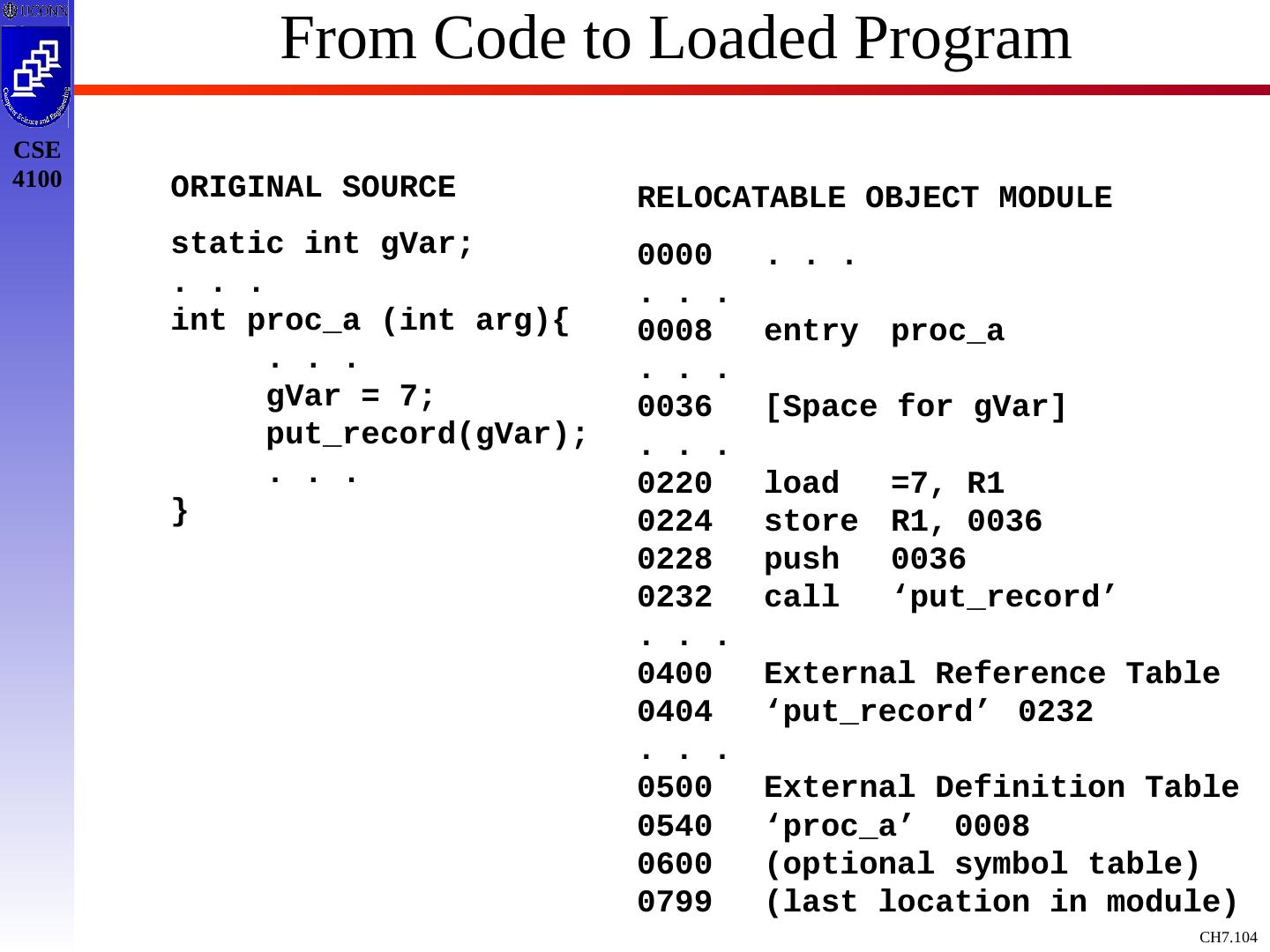 11 .From Code to Loaded Program ORIGINAL SOURCE static int gVar; . . . int proc_a (int arg){ . . . gVar = 7; put_record(gVar); . . . } RELOCATABLE OBJECT MODULE 0000 . . . . . . 0008 entry proc_a . . . 0036 [Space for gVar] . . . 0220 load =7, R1 0224 store R1, 0036 0228 push 0036 0232 call ‘put_record’ . . . 0400 External Reference Table 0404 ‘put_record’ 0232 . . . 0500 External Definition Table 0540 ‘proc_a’ 0008 0600 (optional symbol table) 0799 (last location in module)