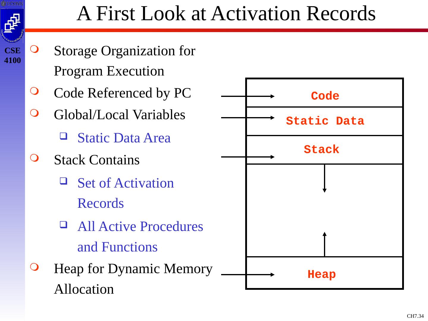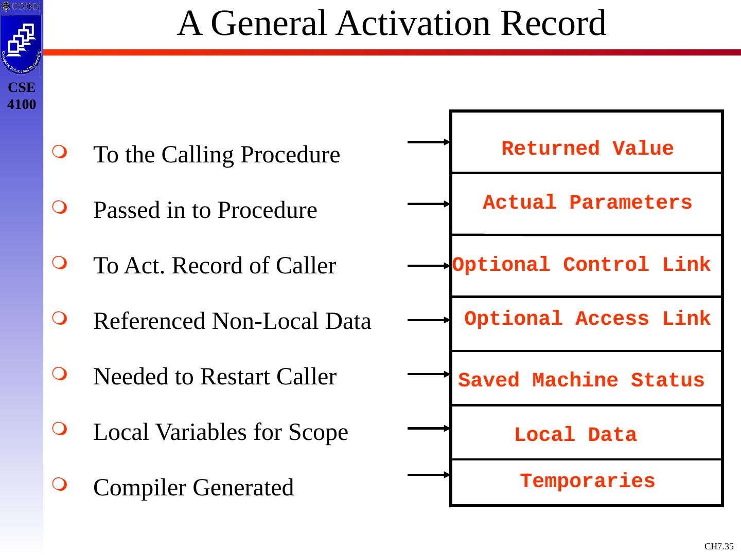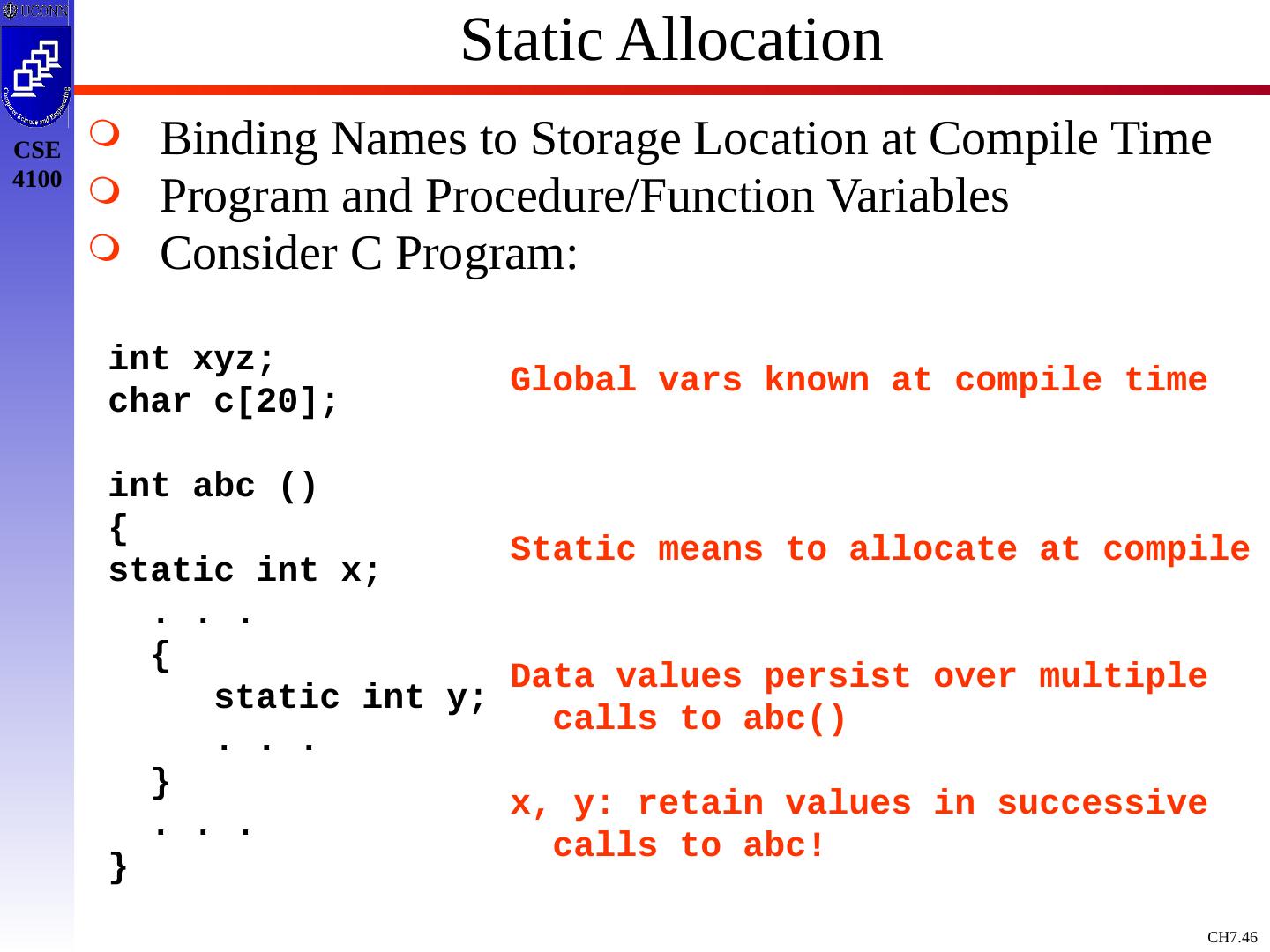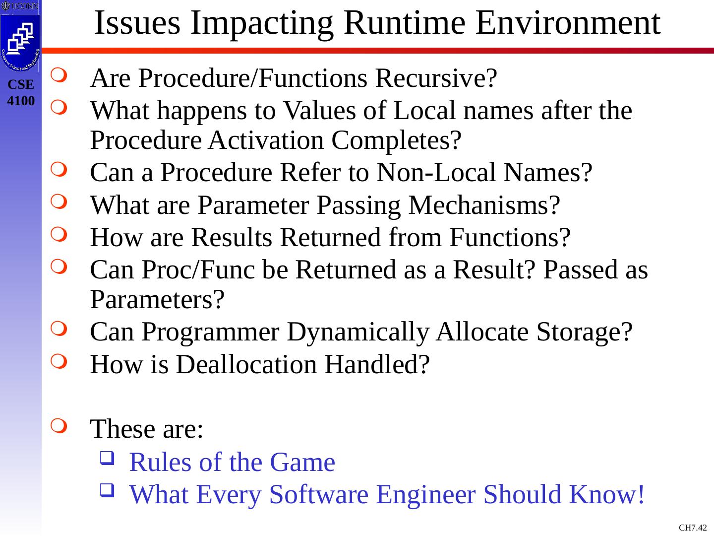 3 .Basic Definitions and Concepts Procedure Definition Declaration that has a Name and has a Body If Returns a value, then Function Procedure Definition Contains a Sequence of Identifiers Called the Formal Parameters Procedure Call Contains a List of Arguments passed to the Procedure or the Actual Parameters Information in Program can be Characterized Environment: Maps Name to Storage Loc (l-value) Store: Maps Location to Value it Contains (l-value to an r-value) Environment State Name Storage Value Compile Time Run Time