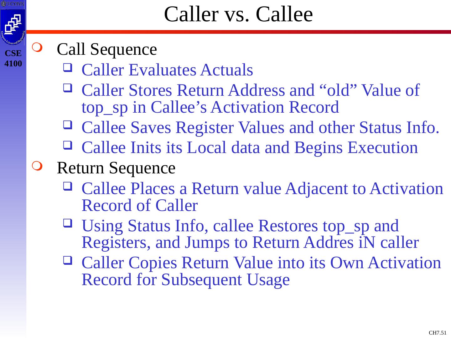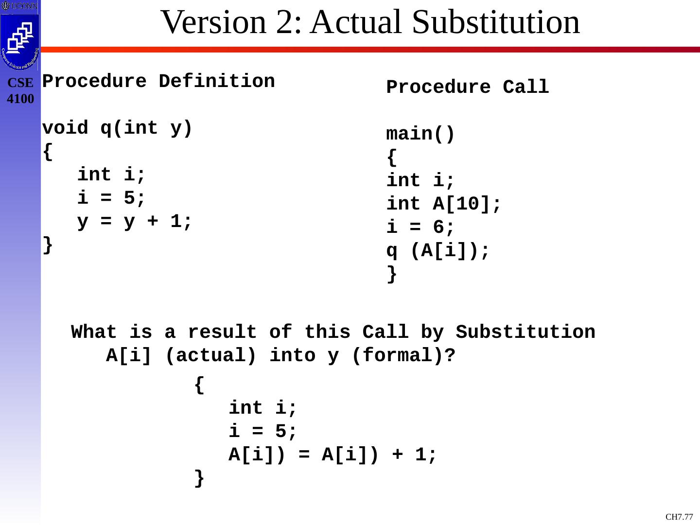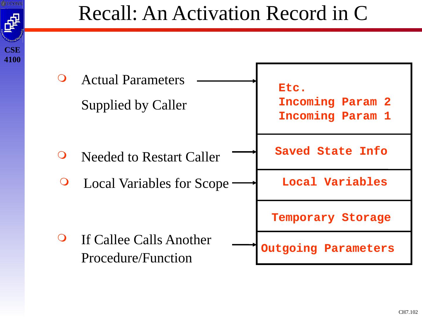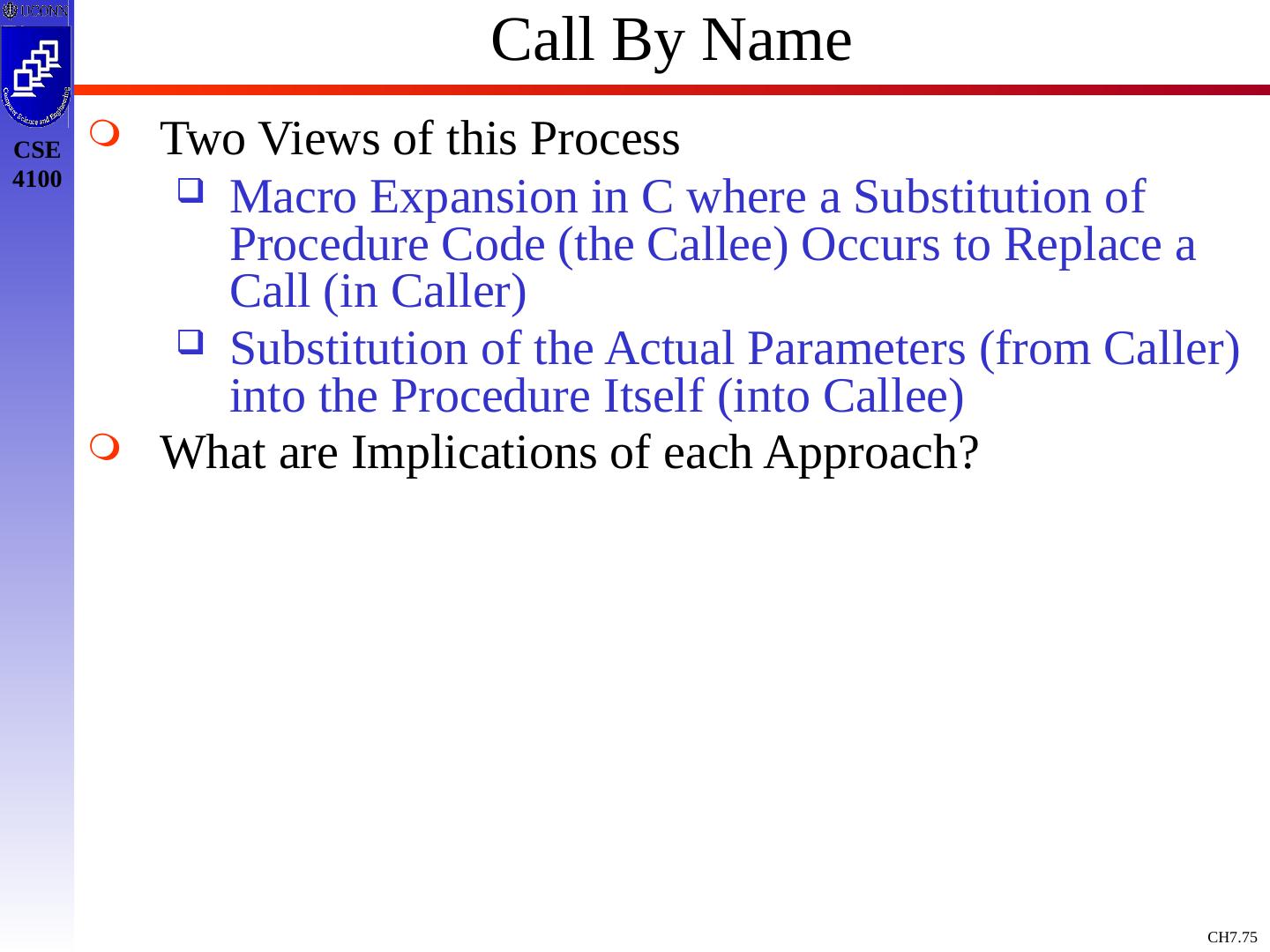3 .Basic Definitions and Concepts Procedure Definition Declaration that has a Name and has a Body If Returns a value, then Function Procedure Definition Contains a Sequence of Identifiers Called the Formal Parameters Procedure Call Contains a List of Arguments passed to the Procedure or the Actual Parameters Information in Program can be Characterized Environment: Maps Name to Storage Loc (l-value) Store: Maps Location to Value it Contains (l-value to an r-value) Environment State Name Storage Value Compile Time Run Time