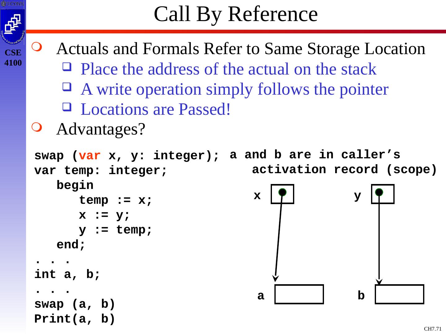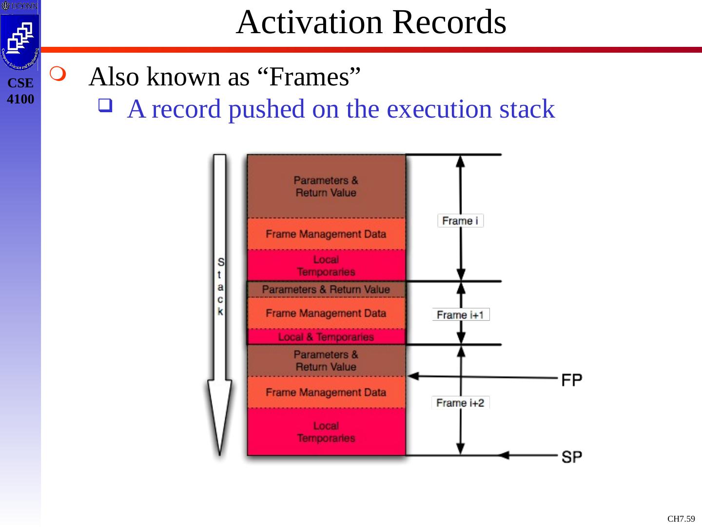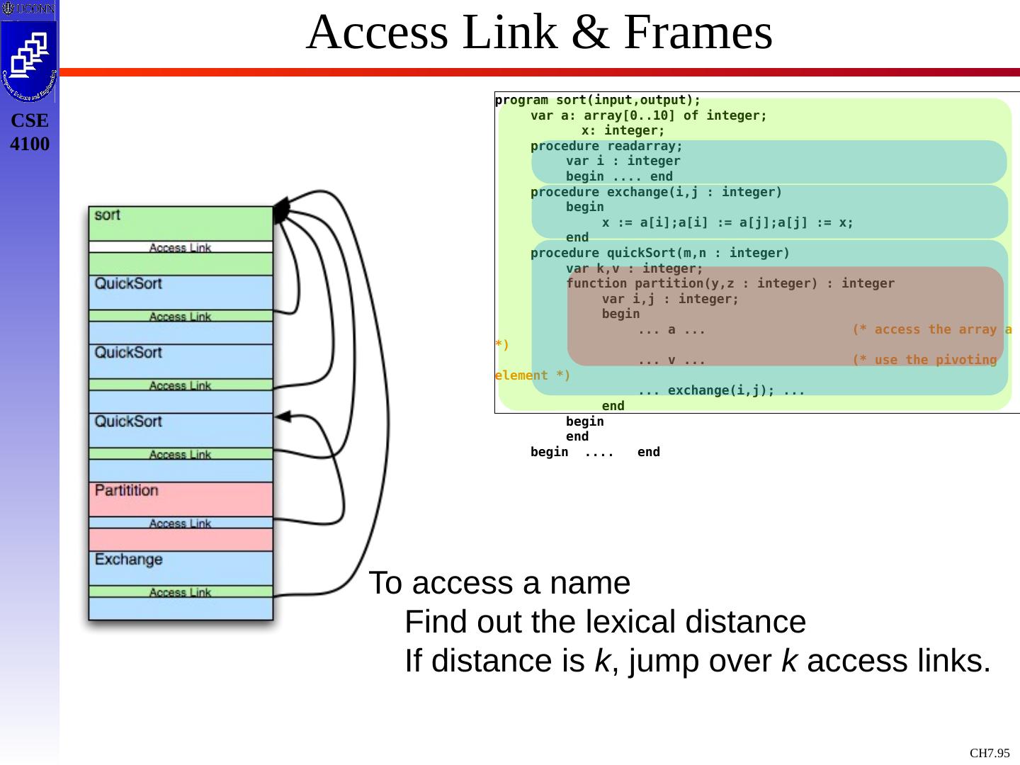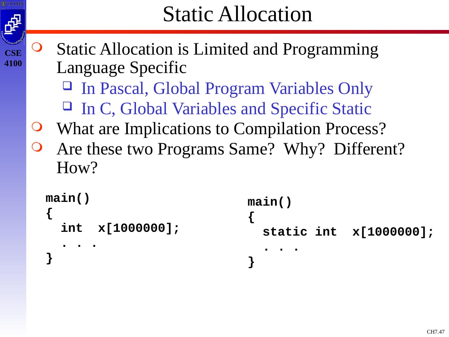 3 .Basic Definitions and Concepts Procedure Definition Declaration that has a Name and has a Body If Returns a value, then Function Procedure Definition Contains a Sequence of Identifiers Called the Formal Parameters Procedure Call Contains a List of Arguments passed to the Procedure or the Actual Parameters Information in Program can be Characterized Environment: Maps Name to Storage Loc (l-value) Store: Maps Location to Value it Contains (l-value to an r-value) Environment State Name Storage Value Compile Time Run Time