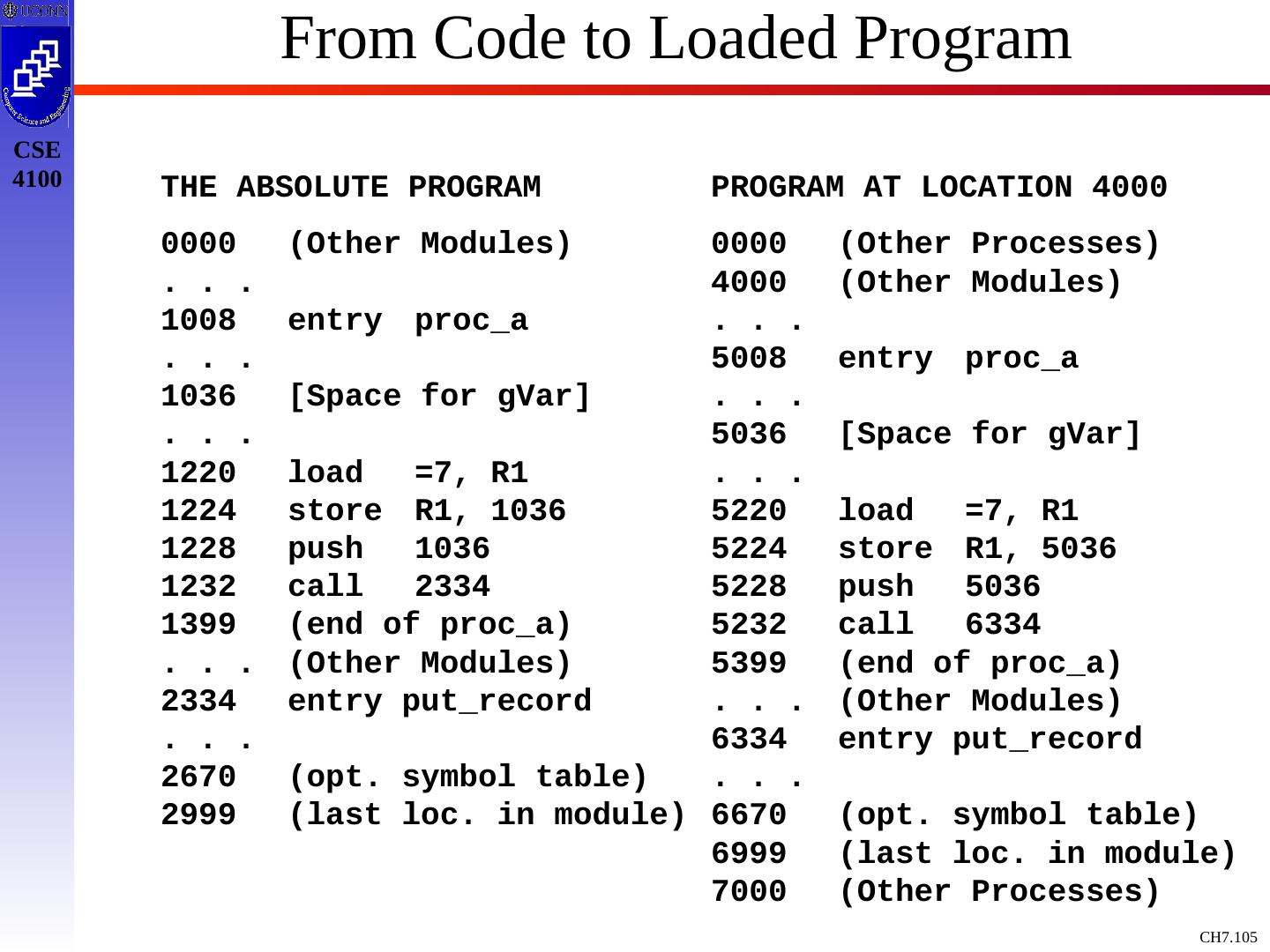 12 .From Code to Loaded Program THE ABSOLUTE PROGRAM 0000 (Other Modules) . . . 1008 entry proc_a . . . 1036 [Space for gVar] . . . 1220 load =7, R1 1224 store R1, 1036 1228 push 1036 1232 call 2334 1399 (end of proc_a) . . . (Other Modules) 2334 entry put_record . . . 2670 (opt. symbol table) 2999 (last loc. in module) PROGRAM AT LOCATION 4000 0000 (Other Processes) 4000 (Other Modules) . . . 5008 entry proc_a . . . 5036 [Space for gVar] . . . 5220 load =7, R1 5224 store R1, 5036 5228 push 5036 5232 call 6334 5399 (end of proc_a) . . . (Other Modules) 6334 entry put_record . . . 6670 (opt. symbol table) 6999 (last loc. in module) 7000 (Other Processes)
