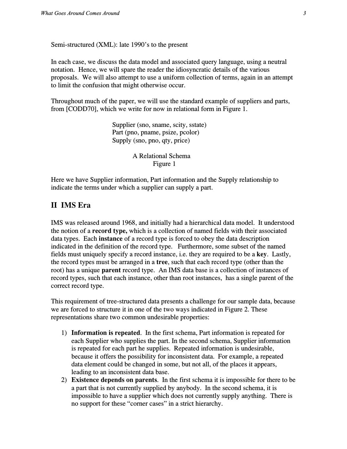 2 .What Goes Around Comes Around 3 Semi-structured (XML): late 1990’s to the present In each case, we discuss the data model and associated query language, using a neutral notation. Hence, we will spare the reader the idiosyncratic details of the various proposals. We will also attempt to use a uniform collection of terms, again in an attempt to limit the confusion that might otherwise occur. Throughout much of the paper, we will use the standard example of suppliers and parts, from [CODD70], which we write for now in relational form in Figure 1. Supplier (sno, sname, scity, sstate) Part (pno, pname, psize, pcolor) Supply (sno, pno, qty, price) A Relational Schema Figure 1 Here we have Supplier information, Part information and the Supply relationship to indicate the terms under which a supplier can supply a part. II IMS Era IMS was released around 1968, and initially had a hierarchical data model. It understood the notion of a record type, which is a collection of named fields with their associated data types. Each instance of a record type is forced to obey the data description indicated in the definition of the record type. Furthermore, some subset of the named fields must uniquely specify a record instance, i.e. they are required to be a key. Lastly, the record types must be arranged in a tree, such that each record type (other than the root) has a unique parent record type. An IMS data base is a collection of instances of record types, such that each instance, other than root instances, has a single parent of the correct record type. This requirement of tree-structured data presents a challenge for our sample data, because we are forced to structure it in one of the two ways indicated in Figure 2. These representations share two common undesirable properties: 1) Information is repeated. In the first schema, Part information is repeated for each Supplier who supplies the part. In the second schema, Supplier information is repeated for each part he supplies. Repeated information is undesirable, because it offers the possibility for inconsistent data. For example, a repeated data element could be changed in some, but not all, of the places it appears, leading to an inconsistent data base. 2) Existence depends on parents. In the first schema it is impossible for there to be a part that is not currently supplied by anybody. In the second schema, it is impossible to have a supplier which does not currently supply anything. There is no support for these “corner cases” in a strict hierarchy.