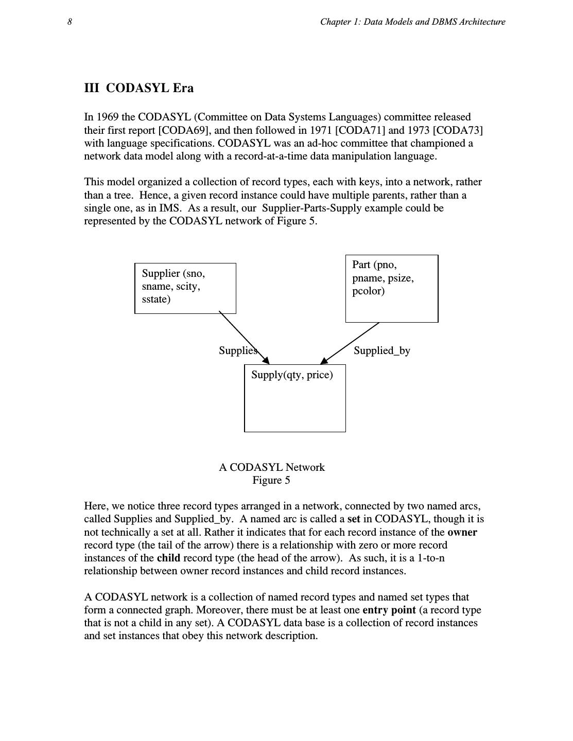 7 .8 Chapter 1: Data Models and DBMS Architecture III CODASYL Era In 1969 the CODASYL (Committee on Data Systems Languages) committee released their first report [CODA69], and then followed in 1971 [CODA71] and 1973 [CODA73] with language specifications. CODASYL was an ad-hoc committee that championed a network data model along with a record-at-a-time data manipulation language. This model organized a collection of record types, each with keys, into a network, rather than a tree. Hence, a given record instance could have multiple parents, rather than a single one, as in IMS. As a result, our Supplier-Parts-Supply example could be represented by the CODASYL network of Figure 5. Part (pno, Supplier (sno, pname, psize, sname, scity, pcolor) sstate) Supplies Supplied_by Supply(qty, price) A CODASYL Network Figure 5 Here, we notice three record types arranged in a network, connected by two named arcs, called Supplies and Supplied_by. A named arc is called a set in CODASYL, though it is not technically a set at all. Rather it indicates that for each record instance of the owner record type (the tail of the arrow) there is a relationship with zero or more record instances of the child record type (the head of the arrow). As such, it is a 1-to-n relationship between owner record instances and child record instances. A CODASYL network is a collection of named record types and named set types that form a connected graph. Moreover, there must be at least one entry point (a record type that is not a child in any set). A CODASYL data base is a collection of record instances and set instances that obey this network description.