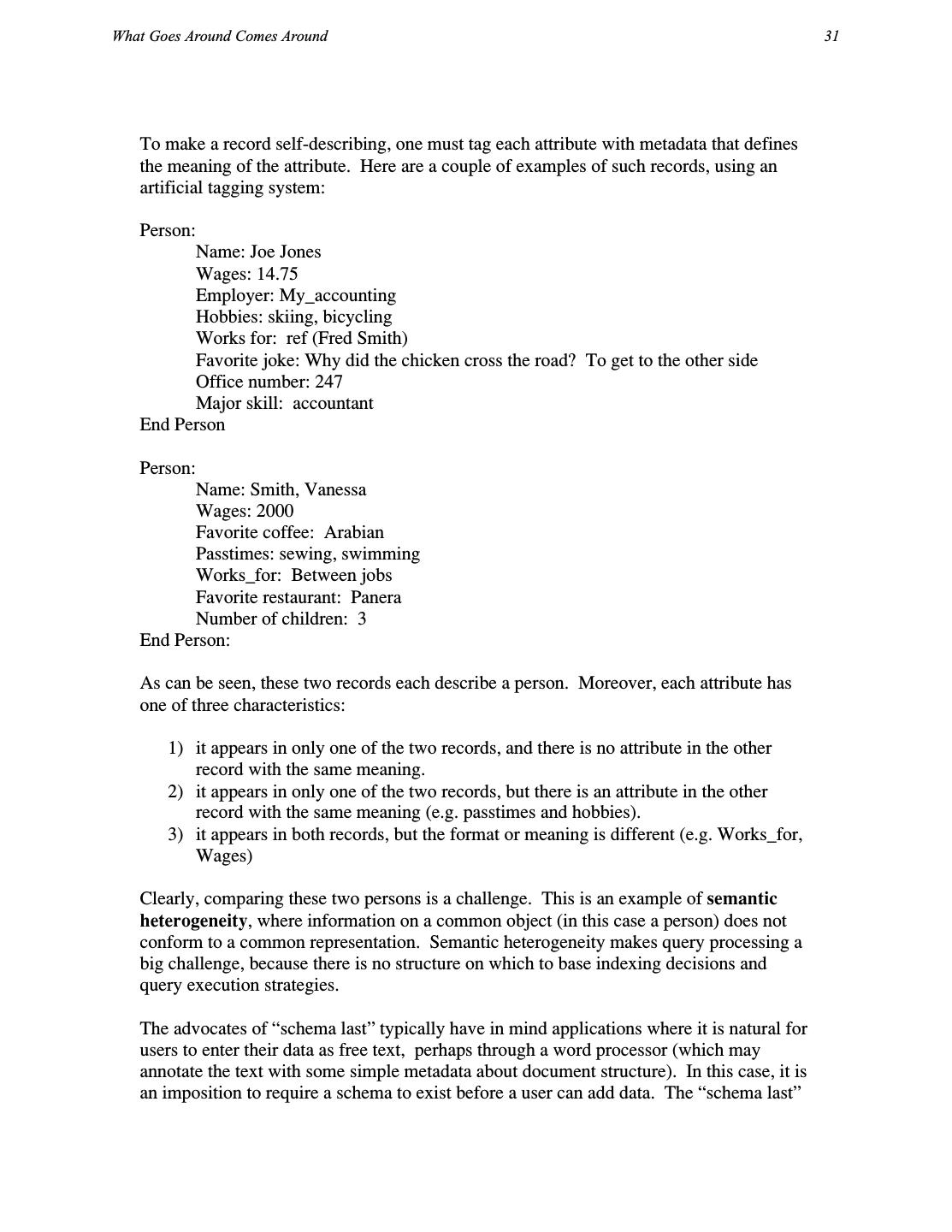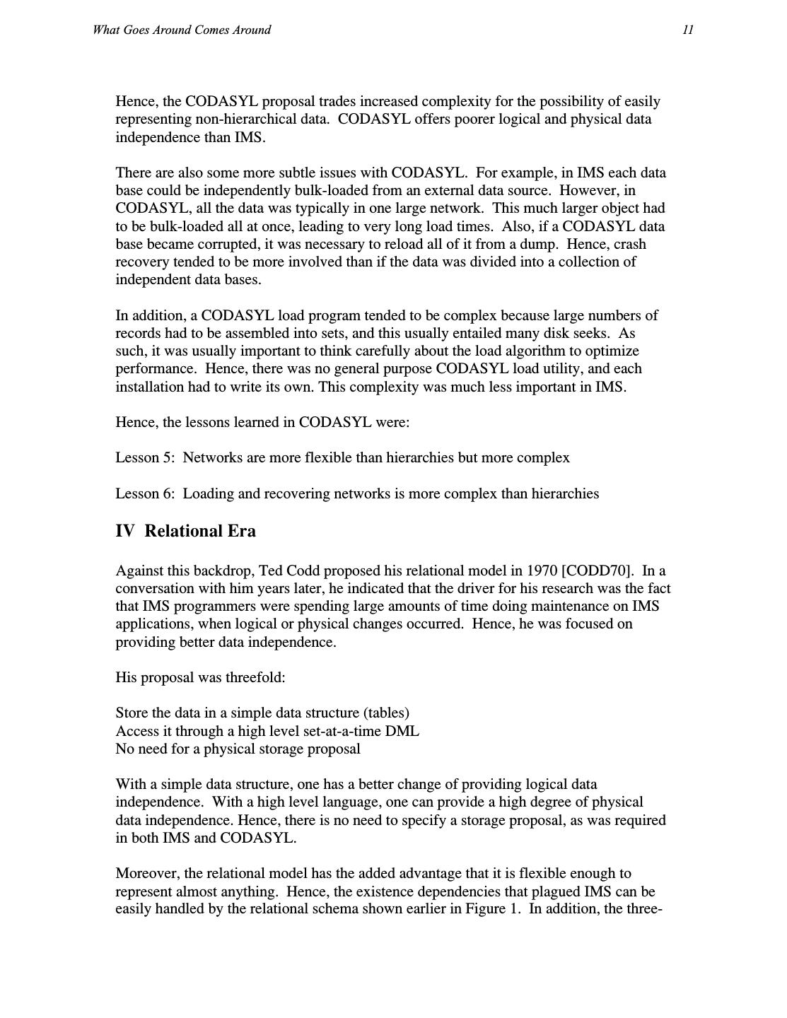 1 . What Goes Around Comes Around Michael Stonebraker Joseph M. Hellerstein Abstract This paper provides a summary of 35 years of data model proposals, grouped into 9 different eras. We discuss the proposals of each era, and show that there are only a few basic data modeling ideas, and most have been around a long time. Later proposals inevitably bear a strong resemblance to certain earlier proposals. Hence, it is a worthwhile exercise to study previous proposals. In addition, we present the lessons learned from the exploration of the proposals in each era. Most current researchers were not around for many of the previous eras, and have limited (if any) understanding of what was previously learned. There is an old adage that he who does not understand history is condemned to repeat it. By presenting “ancient history”, we hope to allow future researchers to avoid replaying history. Unfortunately, the main proposal in the current XML era bears a striking resemblance to the CODASYL proposal from the early 1970’s, which failed because of its complexity. Hence, the current era is replaying history, and “what goes around comes around”. Hopefully the next era will be smarter. I Introduction Data model proposals have been around since the late 1960’s, when the first author “came on the scene”. Proposals have continued with surprising regularity for the intervening 35 years. Moreover, many of the current day proposals have come from researchers too young to have learned from the discussion of earlier ones. Hence, the purpose of this paper is to summarize 35 years worth of “progress” and point out what should be learned from this lengthy exercise. We present data model proposals in nine historical epochs: Hierarchical (IMS): late 1960’s and 1970’s Network (CODASYL): 1970’s Relational: 1970’s and early 1980’s Entity-Relationship: 1970’s Extended Relational: 1980’s Semantic: late 1970’s and 1980’s Object-oriented: late 1980’s and early 1990’s Object-relational: late 1980’s and early 1990’s