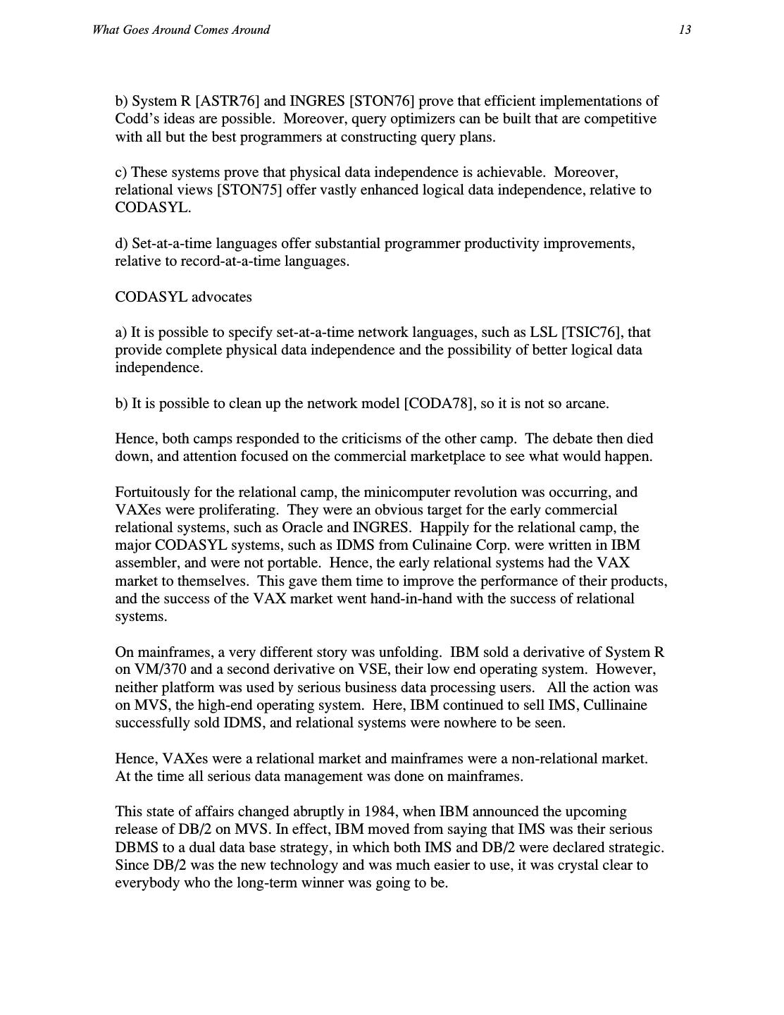 12 .What Goes Around Comes Around 13 b) System R [ASTR76] and INGRES [STON76] prove that efficient implementations of Codd’s ideas are possible. Moreover, query optimizers can be built that are competitive with all but the best programmers at constructing query plans. c) These systems prove that physical data independence is achievable. Moreover, relational views [STON75] offer vastly enhanced logical data independence, relative to CODASYL. d) Set-at-a-time languages offer substantial programmer productivity improvements, relative to record-at-a-time languages. CODASYL advocates a) It is possible to specify set-at-a-time network languages, such as LSL [TSIC76], that provide complete physical data independence and the possibility of better logical data independence. b) It is possible to clean up the network model [CODA78], so it is not so arcane. Hence, both camps responded to the criticisms of the other camp. The debate then died down, and attention focused on the commercial marketplace to see what would happen. Fortuitously for the relational camp, the minicomputer revolution was occurring, and VAXes were proliferating. They were an obvious target for the early commercial relational systems, such as Oracle and INGRES. Happily for the relational camp, the major CODASYL systems, such as IDMS from Culinaine Corp. were written in IBM assembler, and were not portable. Hence, the early relational systems had the VAX market to themselves. This gave them time to improve the performance of their products, and the success of the VAX market went hand-in-hand with the success of relational systems. On mainframes, a very different story was unfolding. IBM sold a derivative of System R on VM/370 and a second derivative on VSE, their low end operating system. However, neither platform was used by serious business data processing users. All the action was on MVS, the high-end operating system. Here, IBM continued to sell IMS, Cullinaine successfully sold IDMS, and relational systems were nowhere to be seen. Hence, VAXes were a relational market and mainframes were a non-relational market. At the time all serious data management was done on mainframes. This state of affairs changed abruptly in 1984, when IBM announced the upcoming release of DB/2 on MVS. In effect, IBM moved from saying that IMS was their serious DBMS to a dual data base strategy, in which both IMS and DB/2 were declared strategic. Since DB/2 was the new technology and was much easier to use, it was crystal clear to everybody who the long-term winner was going to be.