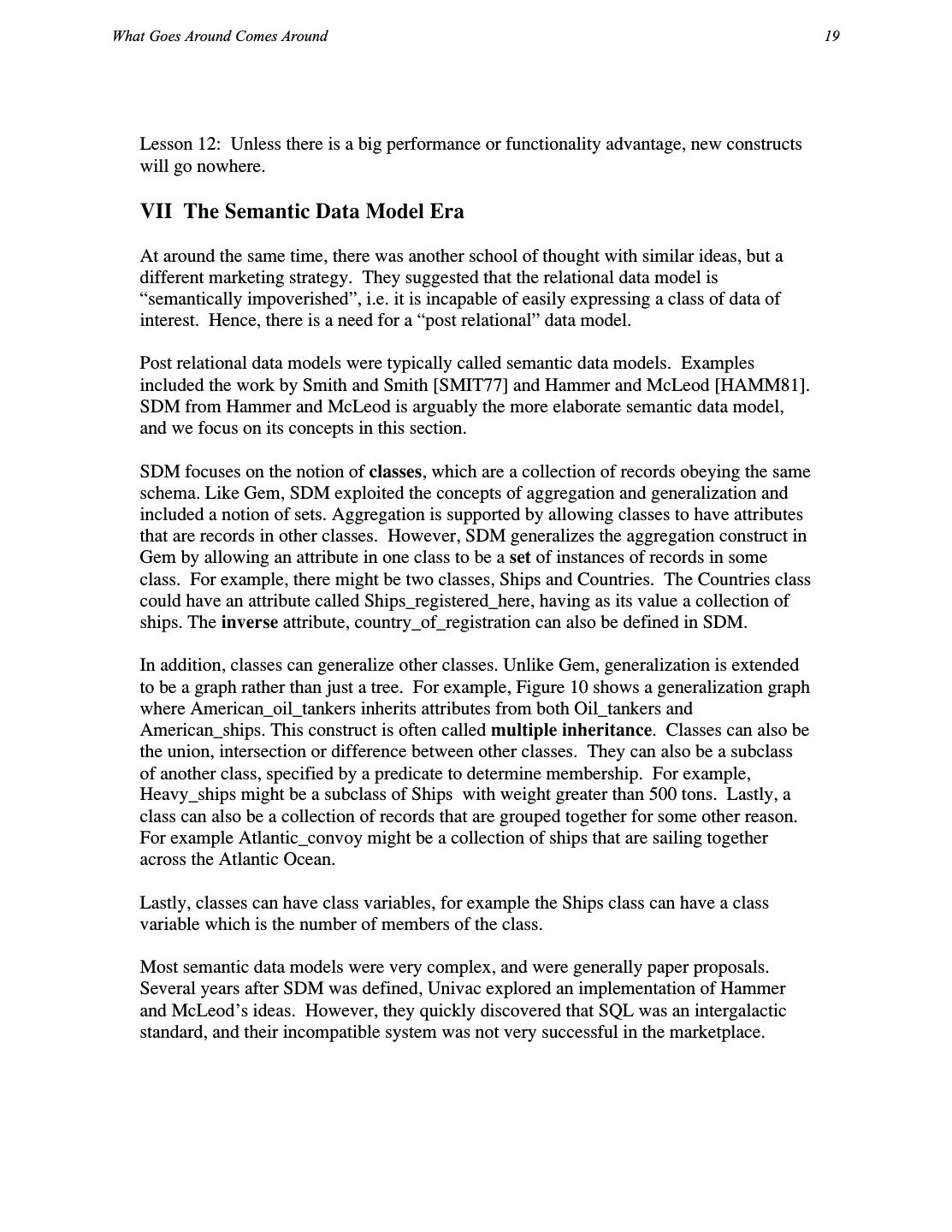 18 .What Goes Around Comes Around 19 Lesson 12: Unless there is a big performance or functionality advantage, new constructs will go nowhere. VII The Semantic Data Model Era At around the same time, there was another school of thought with similar ideas, but a different marketing strategy. They suggested that the relational data model is “semantically impoverished”, i.e. it is incapable of easily expressing a class of data of interest. Hence, there is a need for a “post relational” data model. Post relational data models were typically called semantic data models. Examples included the work by Smith and Smith [SMIT77] and Hammer and McLeod [HAMM81]. SDM from Hammer and McLeod is arguably the more elaborate semantic data model, and we focus on its concepts in this section. SDM focuses on the notion of classes, which are a collection of records obeying the same schema. Like Gem, SDM exploited the concepts of aggregation and generalization and included a notion of sets. Aggregation is supported by allowing classes to have attributes that are records in other classes. However, SDM generalizes the aggregation construct in Gem by allowing an attribute in one class to be a set of instances of records in some class. For example, there might be two classes, Ships and Countries. The Countries class could have an attribute called Ships_registered_here, having as its value a collection of ships. The inverse attribute, country_of_registration can also be defined in SDM. In addition, classes can generalize other classes. Unlike Gem, generalization is extended to be a graph rather than just a tree. For example, Figure 10 shows a generalization graph where American_oil_tankers inherits attributes from both Oil_tankers and American_ships. This construct is often called multiple inheritance. Classes can also be the union, intersection or difference between other classes. They can also be a subclass of another class, specified by a predicate to determine membership. For example, Heavy_ships might be a subclass of Ships with weight greater than 500 tons. Lastly, a class can also be a collection of records that are grouped together for some other reason. For example Atlantic_convoy might be a collection of ships that are sailing together across the Atlantic Ocean. Lastly, classes can have class variables, for example the Ships class can have a class variable which is the number of members of the class. Most semantic data models were very complex, and were generally paper proposals. Several years after SDM was defined, Univac explored an implementation of Hammer and McLeod’s ideas. However, they quickly discovered that SQL was an intergalactic standard, and their incompatible system was not very successful in the marketplace.