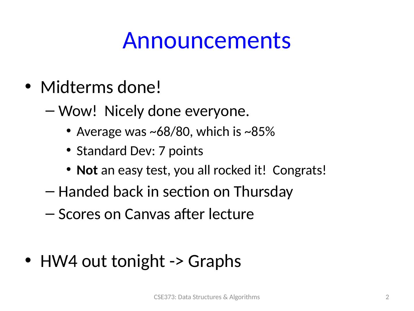2 .Announcements Midterms done! Wow! Nicely done everyone. Average was ~68/80, which is ~85% Standard Dev : 7 points Not an easy test, you all rocked it! Congrats! Handed back in section on Thursday Scores on Canvas after lecture HW4 out tonight -> Graphs CSE373: Data Structures & Algorithms 2
