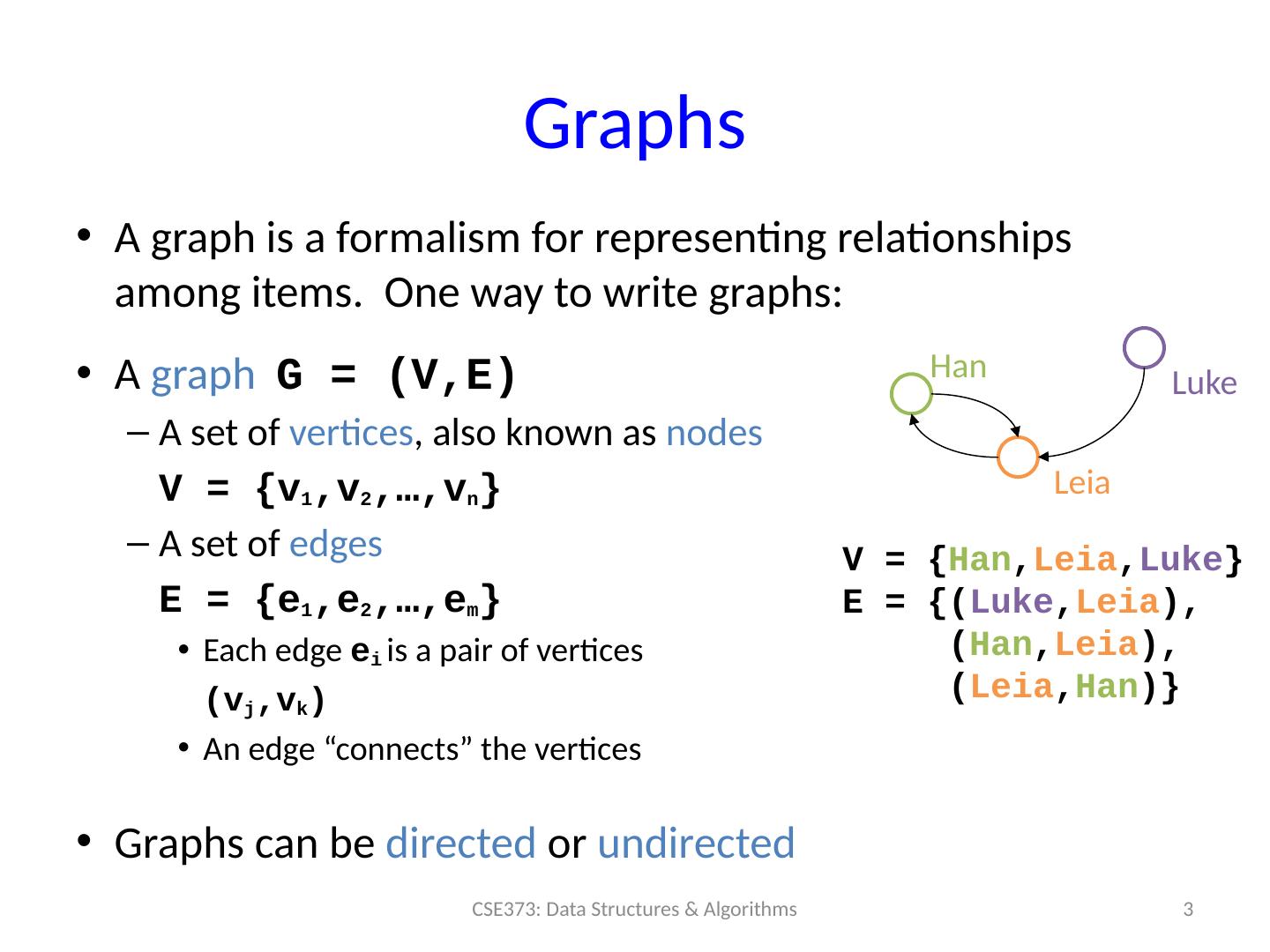 3 .Graphs A graph is a formalism for representing relationships among items. One way to write graphs: A graph G = (V,E) A set of vertices , also known as nodes V = {v 1 ,v 2 ,…, v n } A set of edges E = {e 1 ,e 2 ,…, e m } Each edge e i is a pair of vertices ( v j ,v k ) An edge “connects” the vertices Graphs can be directed or undirected 3 CSE373: Data Structures & Algorithms Han Leia Luke V = { Han , Leia , Luke } E = {( Luke , Leia ), ( Han , Leia ), ( Leia , Han )}