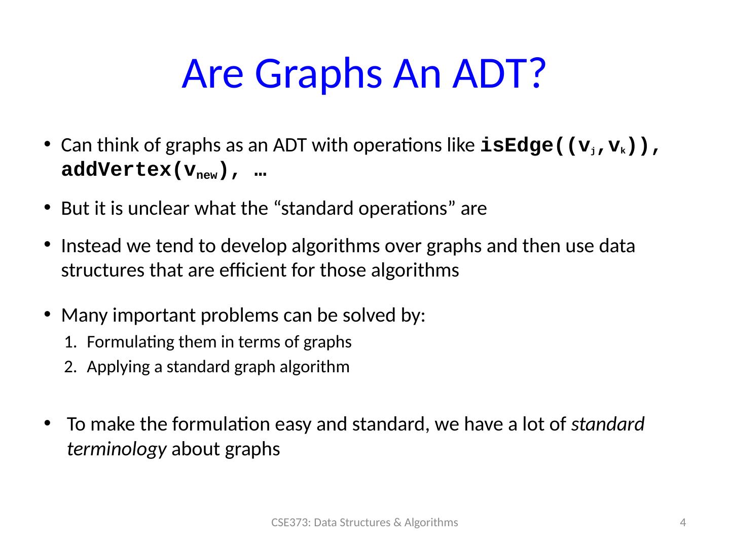 4 .Are Graphs An ADT? Can think of graphs as an ADT with operations like isEdge (( v j ,v k )), addVertex ( v new ), … But it is unclear what the “standard operations” are Instead we tend to develop algorithms over graphs and then use data structures that are efficient for those algorithms Many important problems can be solved by: Formulating them in terms of graphs Applying a standard graph algorithm To make the formulation easy and standard, we have a lot of standard terminology about graphs 4 CSE373: Data Structures & Algorithms