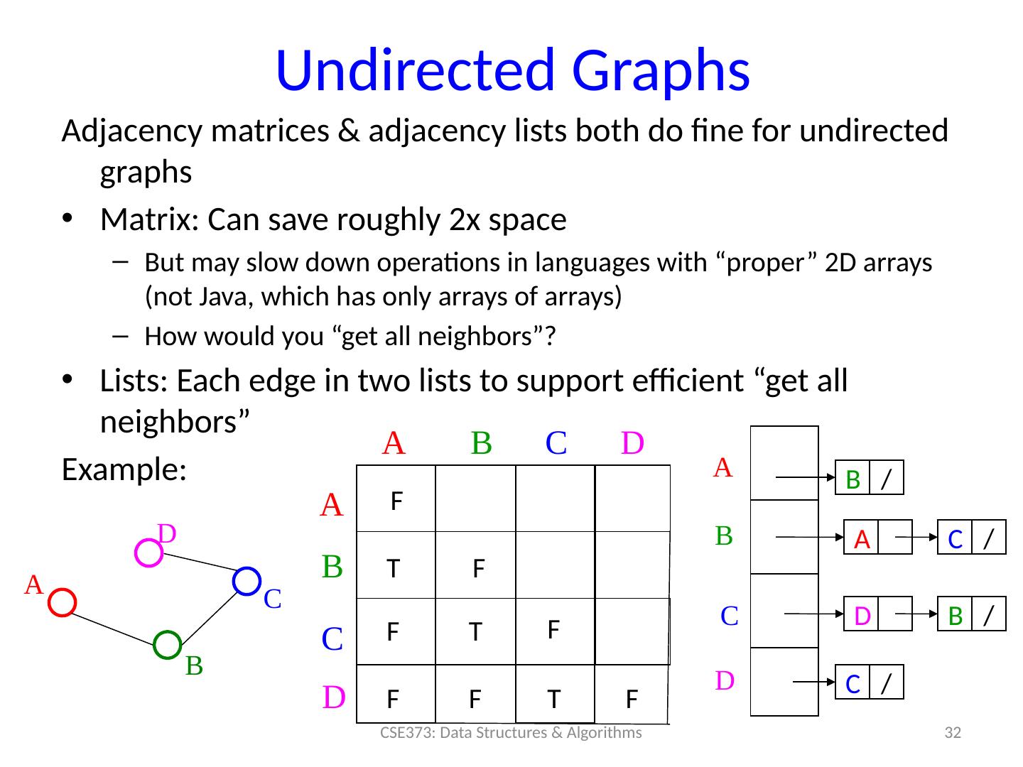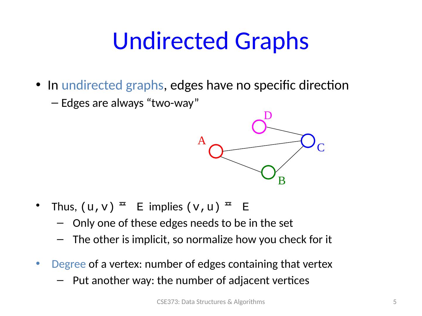5 .Undirected Graphs In undirected graphs , edges have no specific direction Edges are always “two-way” 5 CSE373: Data Structures & Algorithms Thus, ( u,v ) E implies ( v,u ) E Only one of these edges needs to be in the set The other is implicit, so normalize how you check for it Degree of a vertex: number of edges containing that vertex Put another way: the number of adjacent vertices A B C D