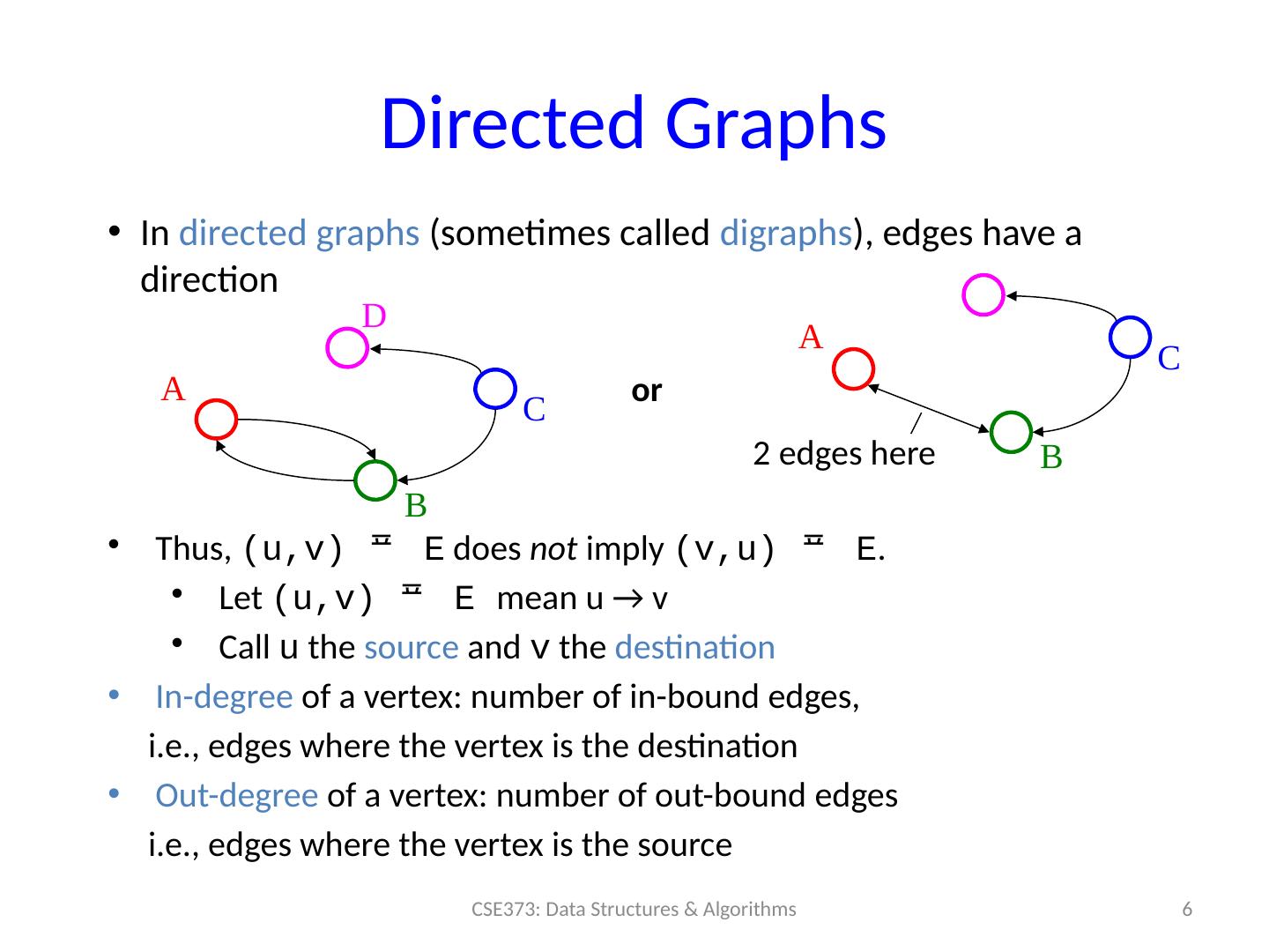 6 .Directed Graphs In directed graphs (sometimes called digraphs ), edges have a direction 6 CSE373: Data Structures & Algorithms Thus, ( u,v ) E does not imply ( v,u ) E . Let ( u,v ) E mean u → v C all u the source and v the destination In-degree of a vertex: number of in-bound edges, i.e., edges where the vertex is the destination Out-degree of a vertex: number of out-bound edges i.e., edges where the vertex is the source or 2 edges here A B C D A B C