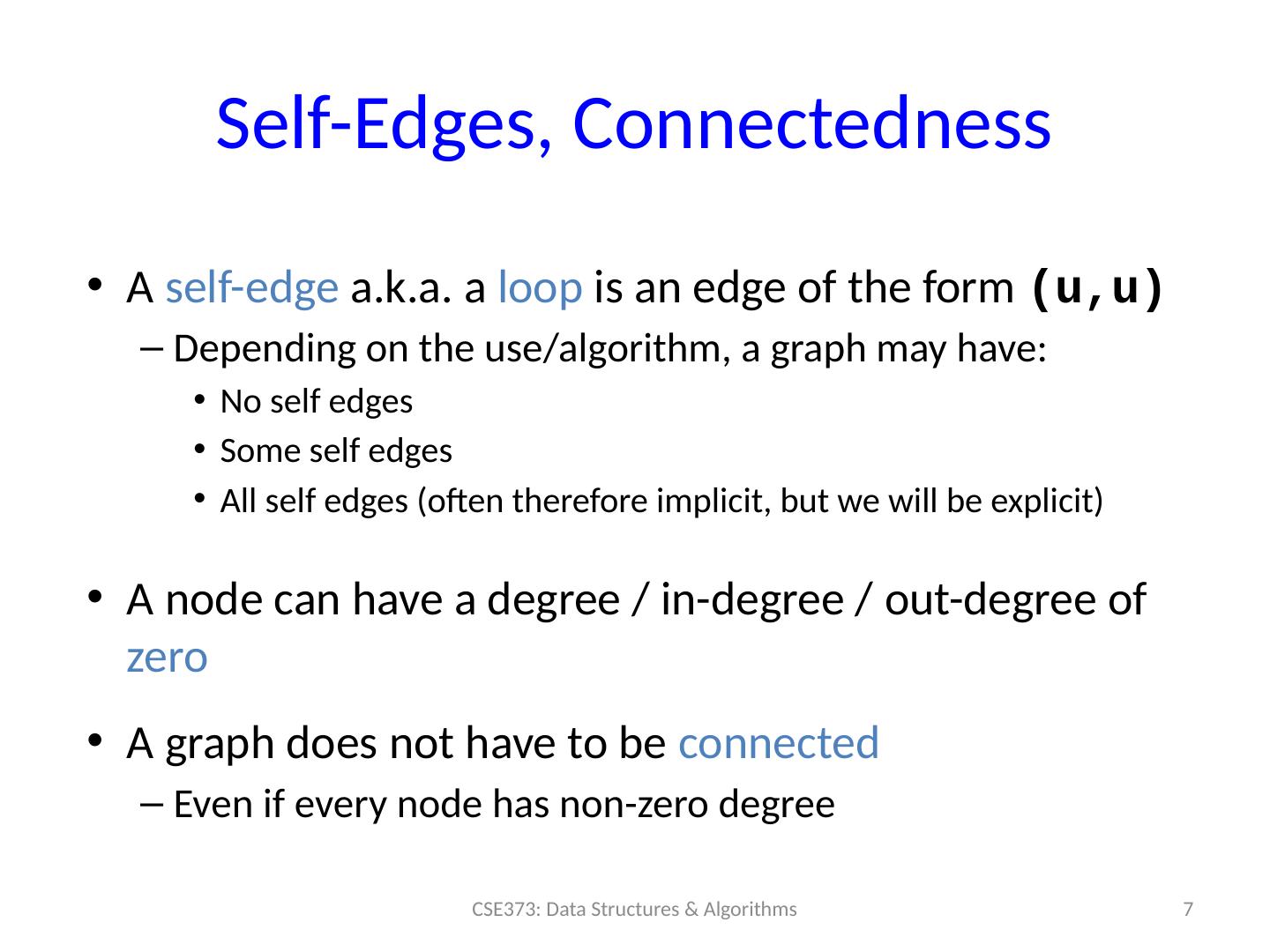 7 .Self-Edges, Connectedness A self-edge a.k.a. a loop is an edge of the form ( u,u ) Depending on the use/algorithm, a graph may have: No self edges Some self edges All self edges (often therefore implicit, but we will be explicit) A node can have a degree / in-degree / out-degree of zero A graph does not have to be connected Even if every node has non-zero degree 7 CSE373: Data Structures & Algorithms