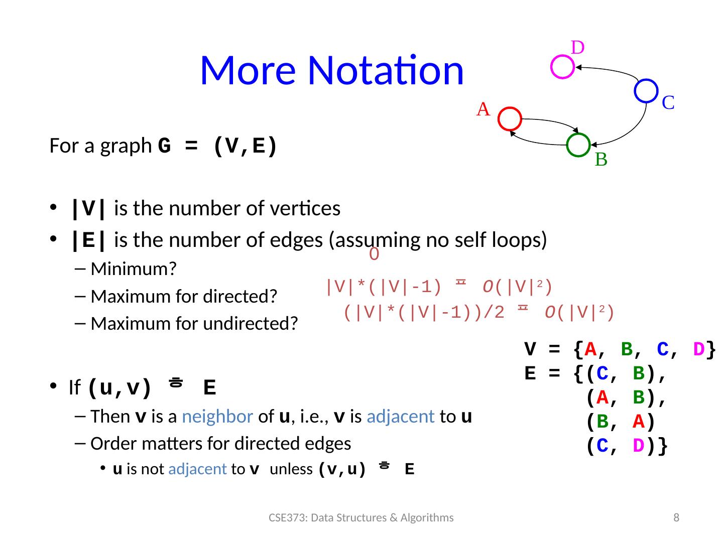 8 .More Notation For a graph G = (V,E) |V| is the number of vertices |E| is the number of edges (assuming no self loops) Minimum? Maximum for directed ? Maximum for undirected ? If ( u,v ) E Then v is a neighbor of u , i.e., v is adjacent to u Order matters for directed edges u is not adjacent to v unless ( v,u ) E 8 CSE373: Data Structures & Algorithms A B C V = { A , B , C , D } E = {( C , B ), ( A , B ), ( B , A ) ( C , D )} D 0 (| V |*(|V|-1))/ 2 O (|V| 2 ) |V | *( |V|-1) O (|V| 2 )
