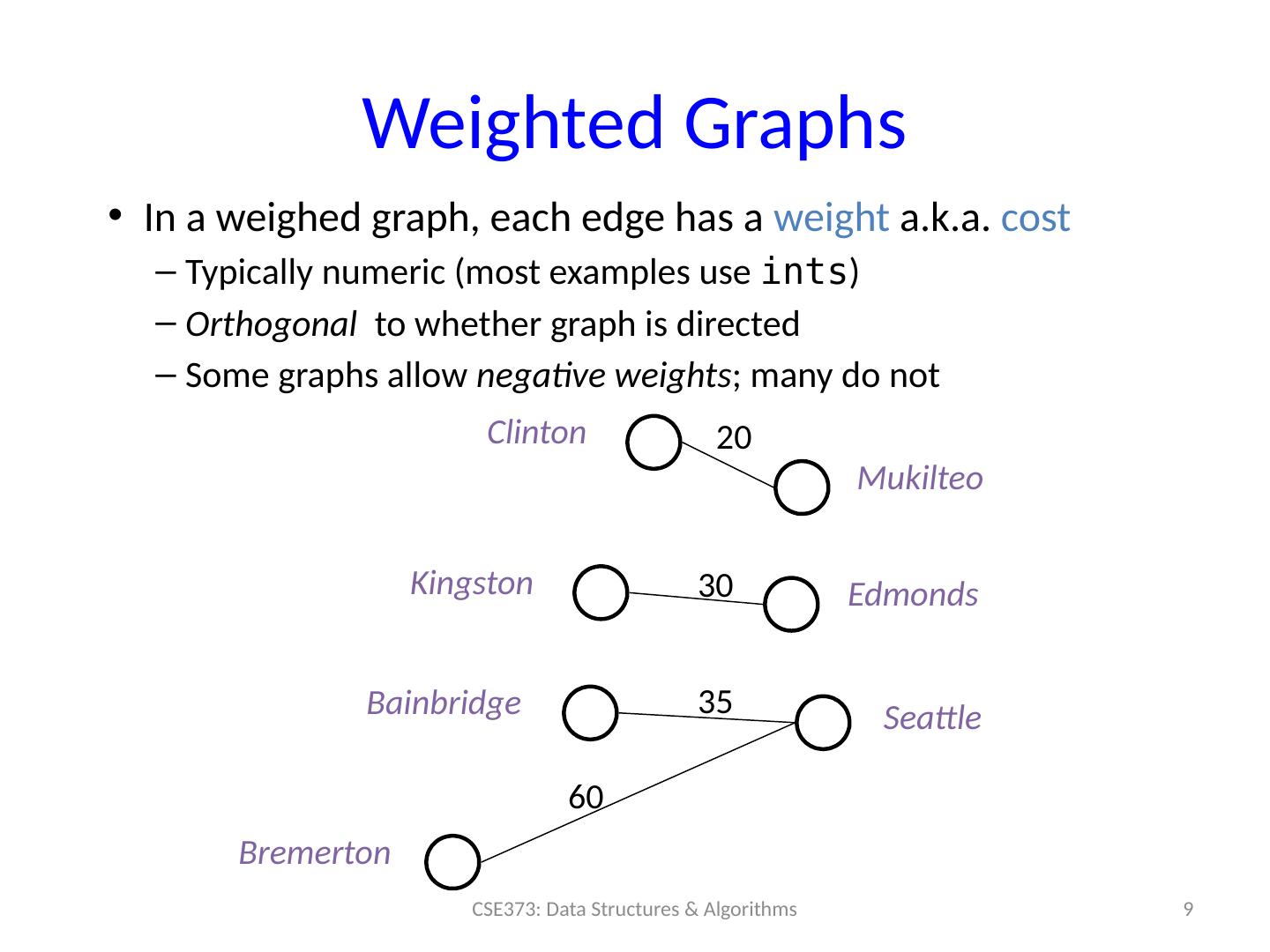 9 .Weighted Graphs In a weighed graph, each edge has a weight a.k.a. cost Typically numeric (most examples use ints ) Orthogonal to whether graph is directed Some graphs allow negative weights ; many do not 9 CSE373: Data Structures & Algorithms 20 30 35 60 Mukilteo Edmonds Seattle Bremerton Bainbridge Kingston Clinton