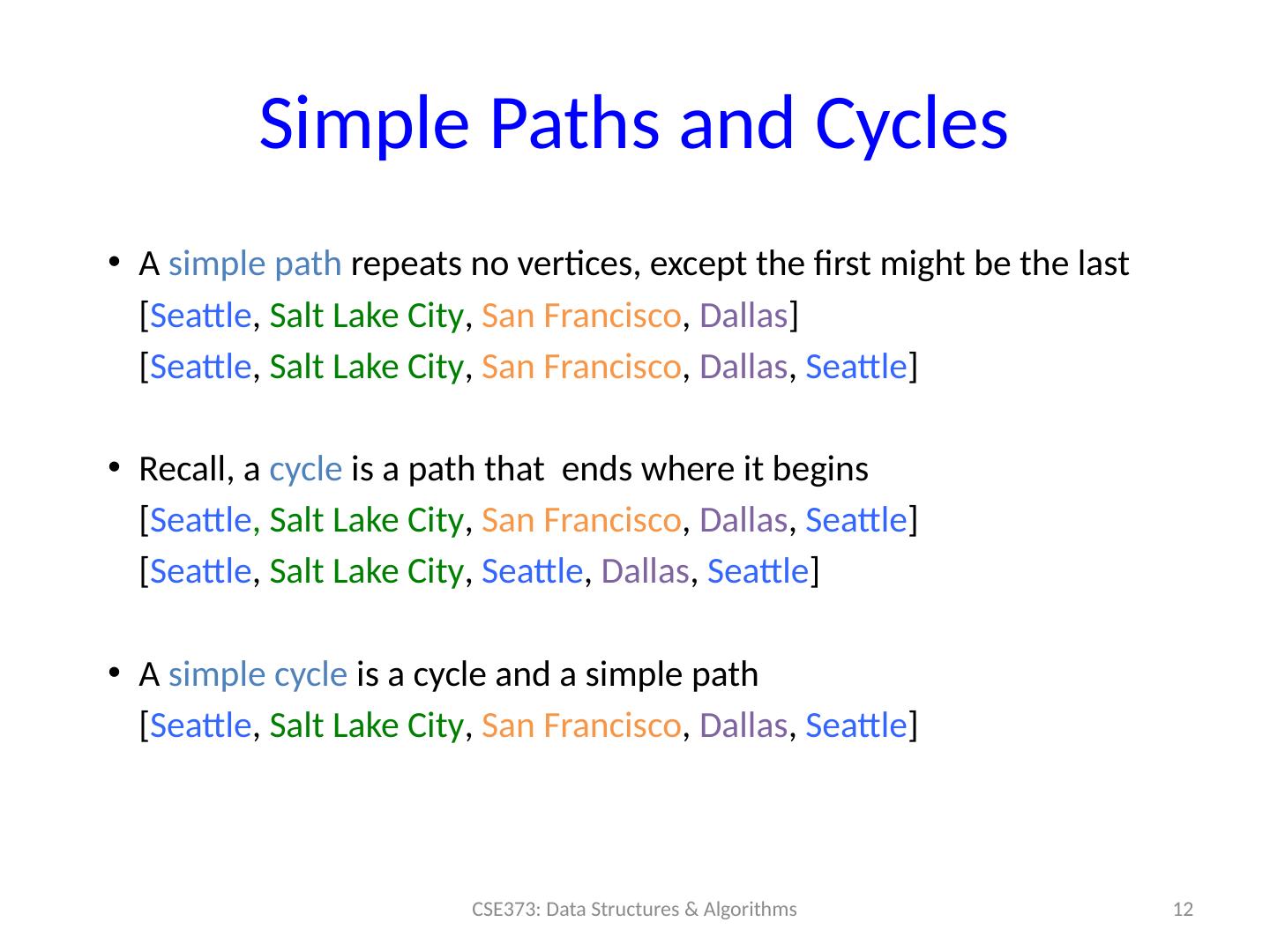 12 .Simple Paths and Cycles A simple path repeats no vertices, except the first might be the last [ Seattle , Salt Lake City , San Francisco , Dallas ] [ Seattle , Salt Lake City , San Francisco , Dallas , Seattle ] Recall, a cycle is a path that ends where it begins [ Seattle , Salt Lake City , San Francisco , Dallas , Seattle ] [ Seattle , Salt Lake City , Seattle , Dallas , Seattle ] A simple cycle is a cycle and a simple path [ Seattle , Salt Lake City , San Francisco , Dallas , Seattle ] 12 CSE373: Data Structures & Algorithms
