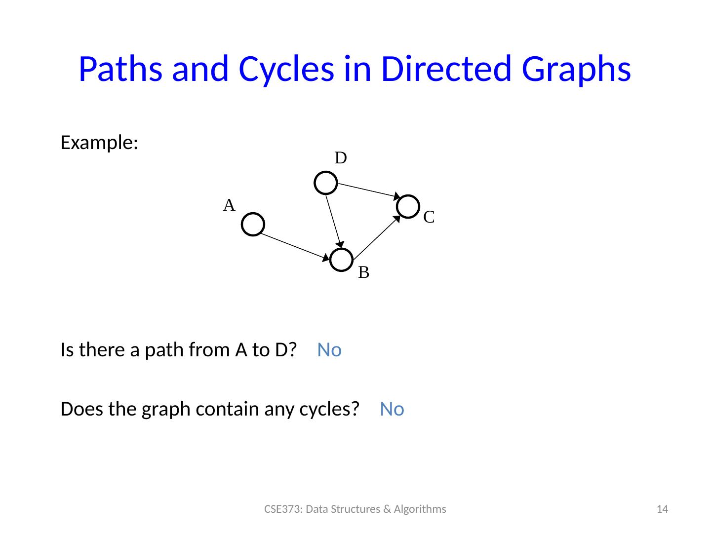14 .Paths and Cycles in Directed Graphs Example: Is there a path from A to D? No Does the graph contain any cycles? No 14 CSE373: Data Structures & Algorithms A B C D