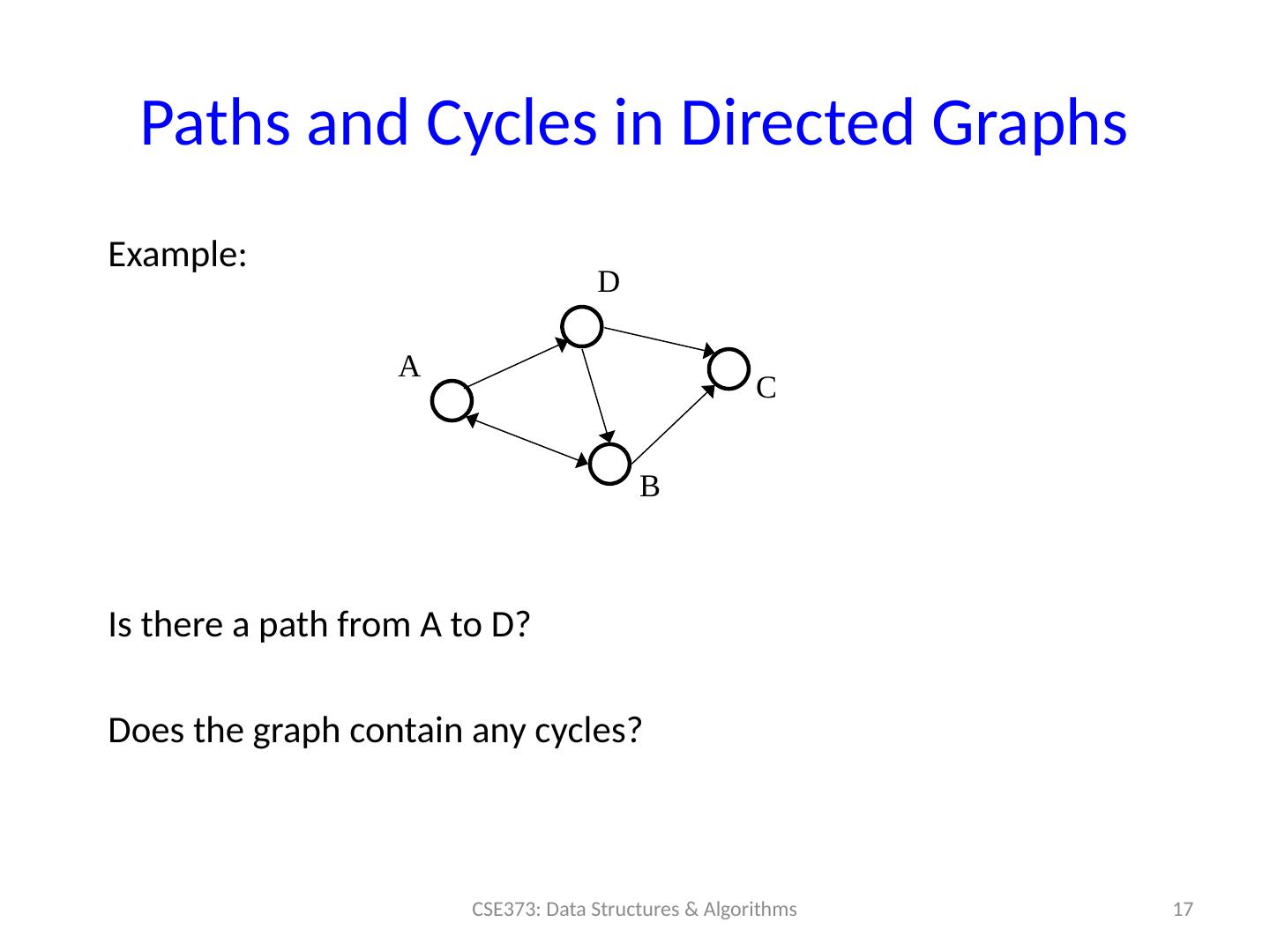 17 .Paths and Cycles in Directed Graphs Example: Is there a path from A to D? Does the graph contain any cycles? 17 CSE373: Data Structures & Algorithms A B C D