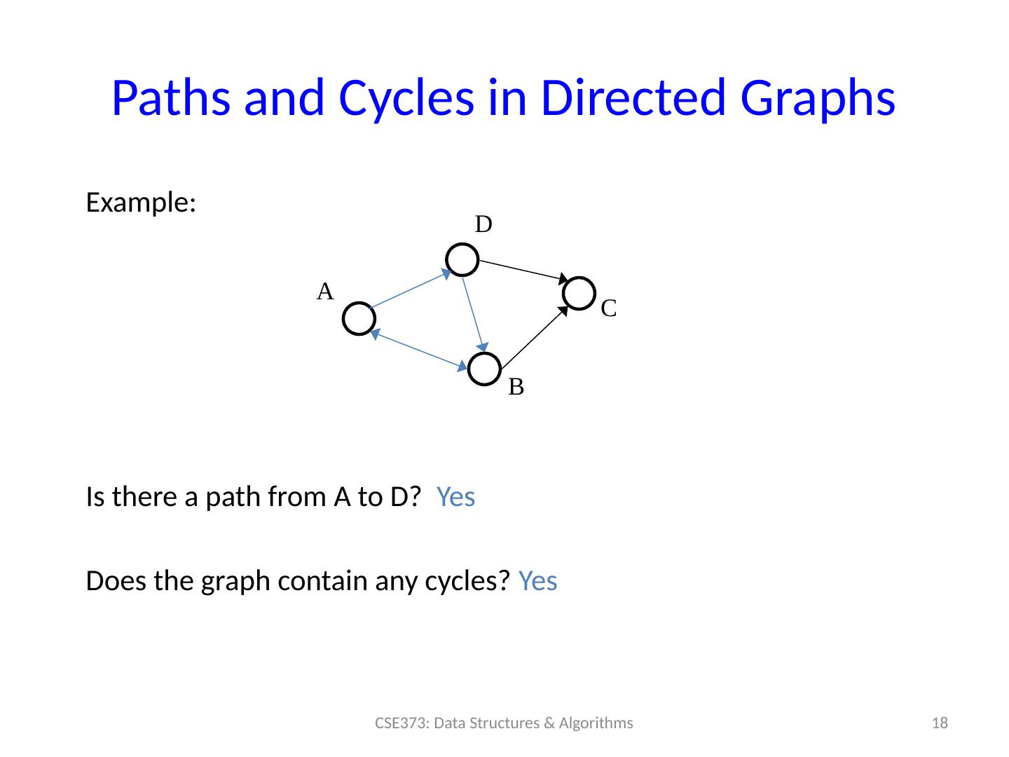 18 .Paths and Cycles in Directed Graphs Example: Is there a path from A to D ? Yes Does the graph contain any cycles ? Yes 18 CSE373: Data Structures & Algorithms A B C D