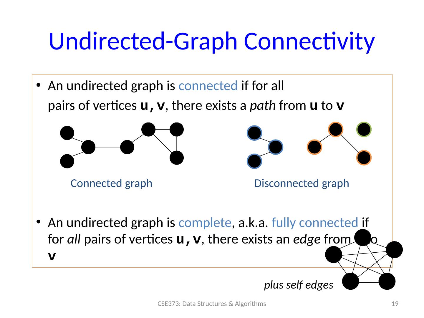19 .Undirected-Graph Connectivity An undirected graph is connected if for all pairs of vertices u,v , there exists a path from u to v An undirected graph is complete , a.k.a. fully connected if for all pairs of vertices u,v , there exists an edge from u to v 19 CSE373: Data Structures & Algorithms Connected graph Disconnected graph plus self edges
