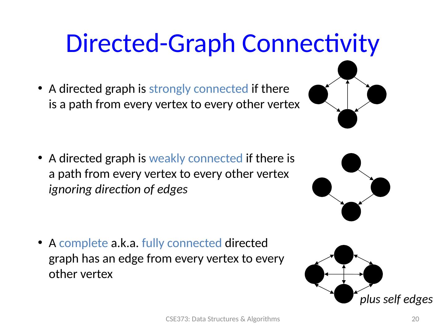 20 .Directed-Graph Connectivity A directed graph is strongly connected if there is a path from every vertex to every other vertex A directed graph is weakly connected if there is a path from every vertex to every other vertex ignoring direction of edges A complete a.k.a. fully connected directed graph has an edge from every vertex to every other vertex 20 CSE373: Data Structures & Algorithms plus self edges