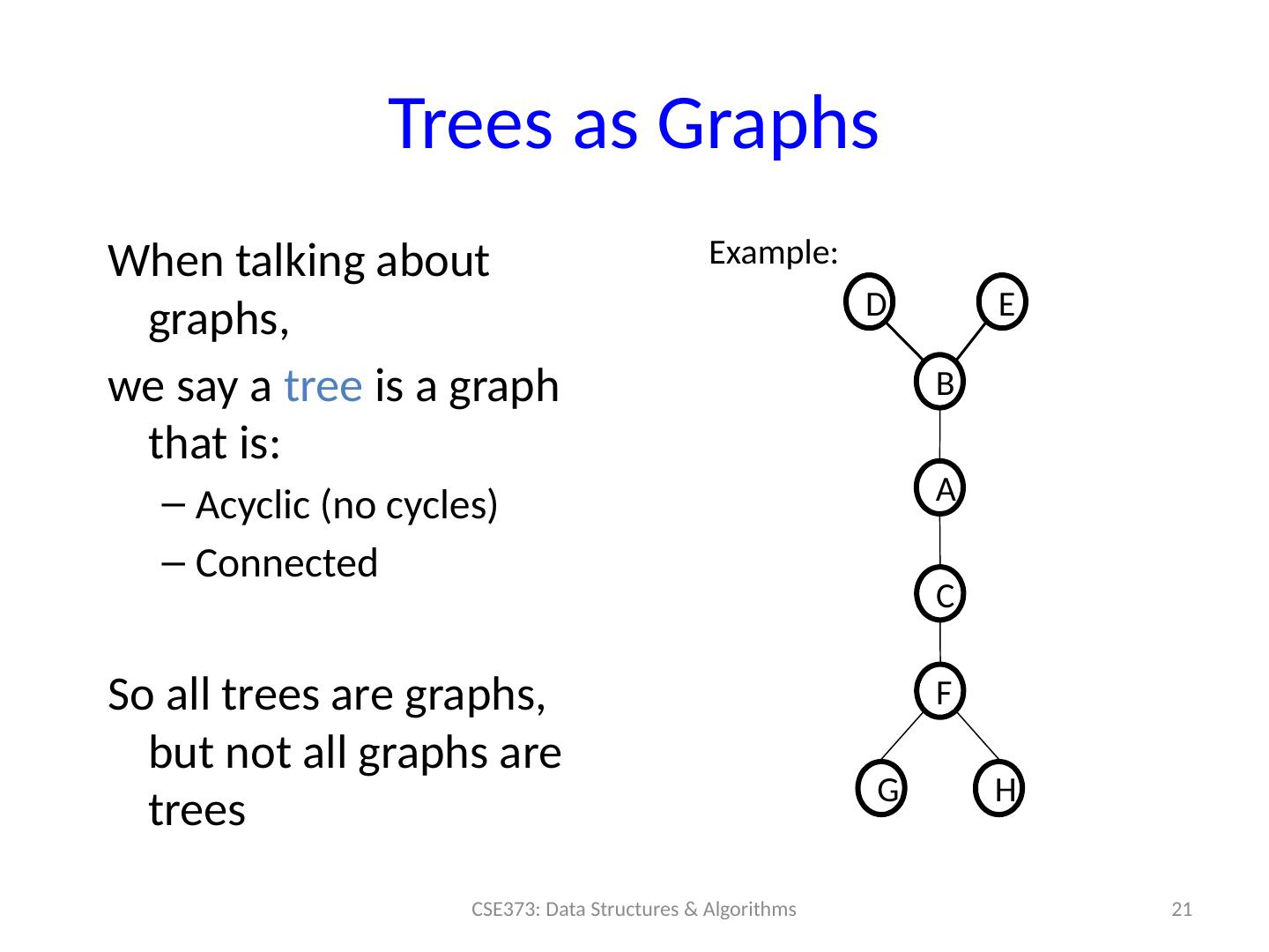 21 .Trees as Graphs When talking about graphs, we say a tree is a graph that is: Acyclic (no cycles) Connected So all trees are graphs, but not all graphs are trees 21 CSE373: Data Structures & Algorithms A B D E C F H G Example: