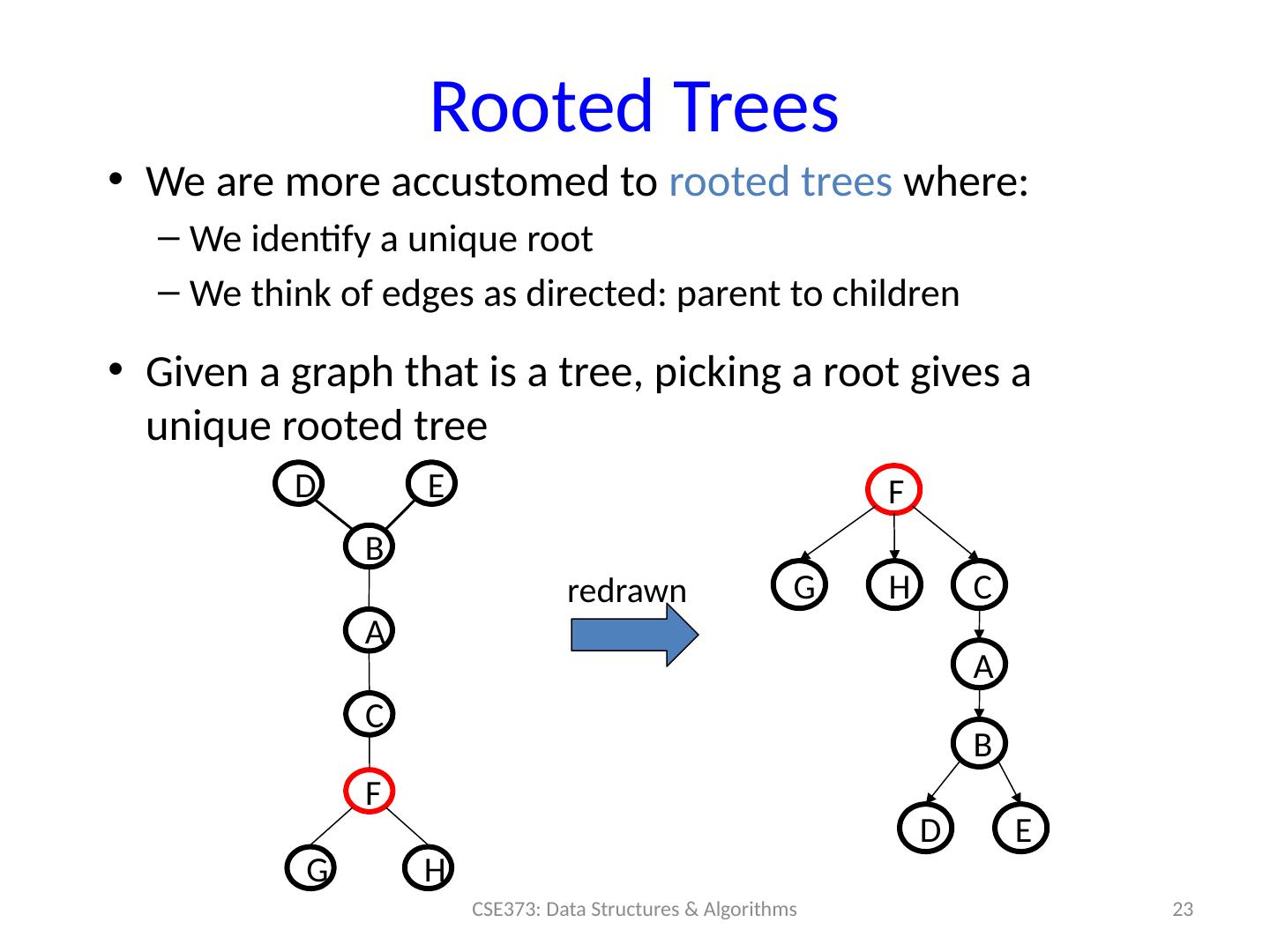 23 .Rooted Trees 23 CSE373: Data Structures & Algorithms A B D E C F H G redrawn F G H C A B D E We are more accustomed to rooted trees where: We identify a unique root We think of edges as directed: parent to children Given a graph that is a tree, picking a root gives a unique rooted tree