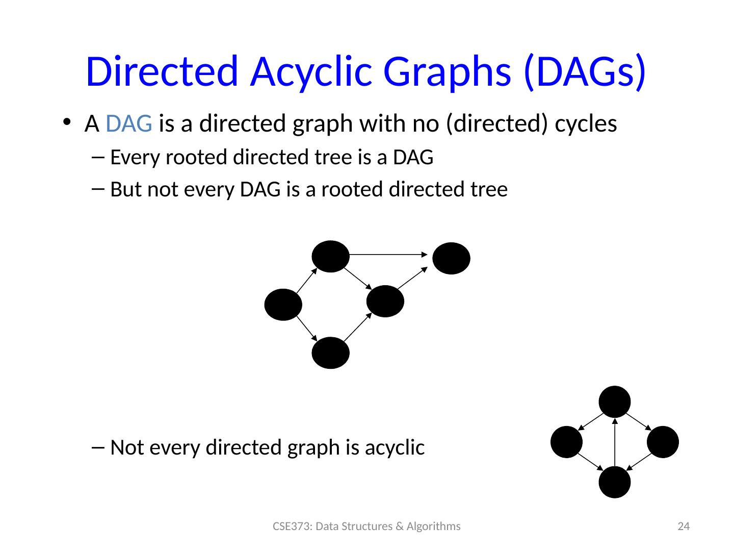 24 .Directed Acyclic Graphs (DAGs) A DAG is a directed graph with no (directed) cycles Every rooted directed tree is a DAG But not every DAG is a rooted directed tree Not every directed graph is acyclic 24 CSE373: Data Structures & Algorithms