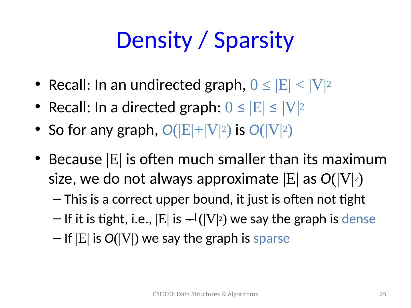 25 .Density / Sparsity Recall: In an undirected graph, 0 ≤ |E| < |V| 2 Recall: In a directed graph: 0 ≤ |E| ≤ |V| 2 So for any graph, O (|E|+|V| 2 ) is O (|V| 2 ) Because |E| is often much smaller than its maximum size, we do not always approximate |E| as O (|V| 2 ) This is a correct upper bound , it just is often not tight If it is tight, i.e., |E| is (|V| 2 ) we say the graph is dense If |E| is O (|V|) we say the graph is sparse 25 CSE373: Data Structures & Algorithms