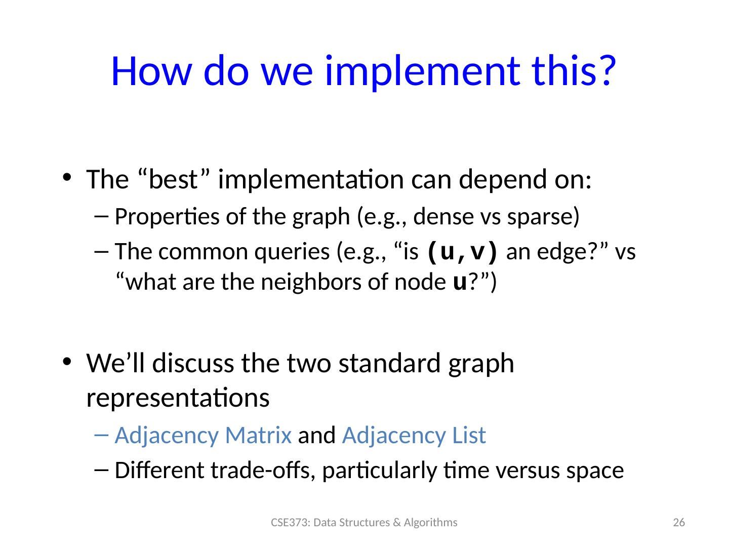 26 .How do we implement this? The “ best” implementation can depend on: P roperties of the graph (e.g., dense vs sparse ) The common queries (e.g., “is ( u,v ) an edge?” vs “what are the neighbors of node u ?”) We’ll discuss the two standard graph representations Adjacency Matrix and Adjacency List Different trade-offs, particularly time versus space 26 CSE373: Data Structures & Algorithms