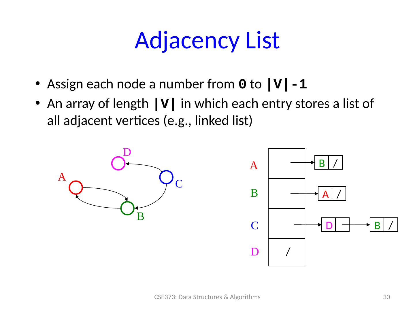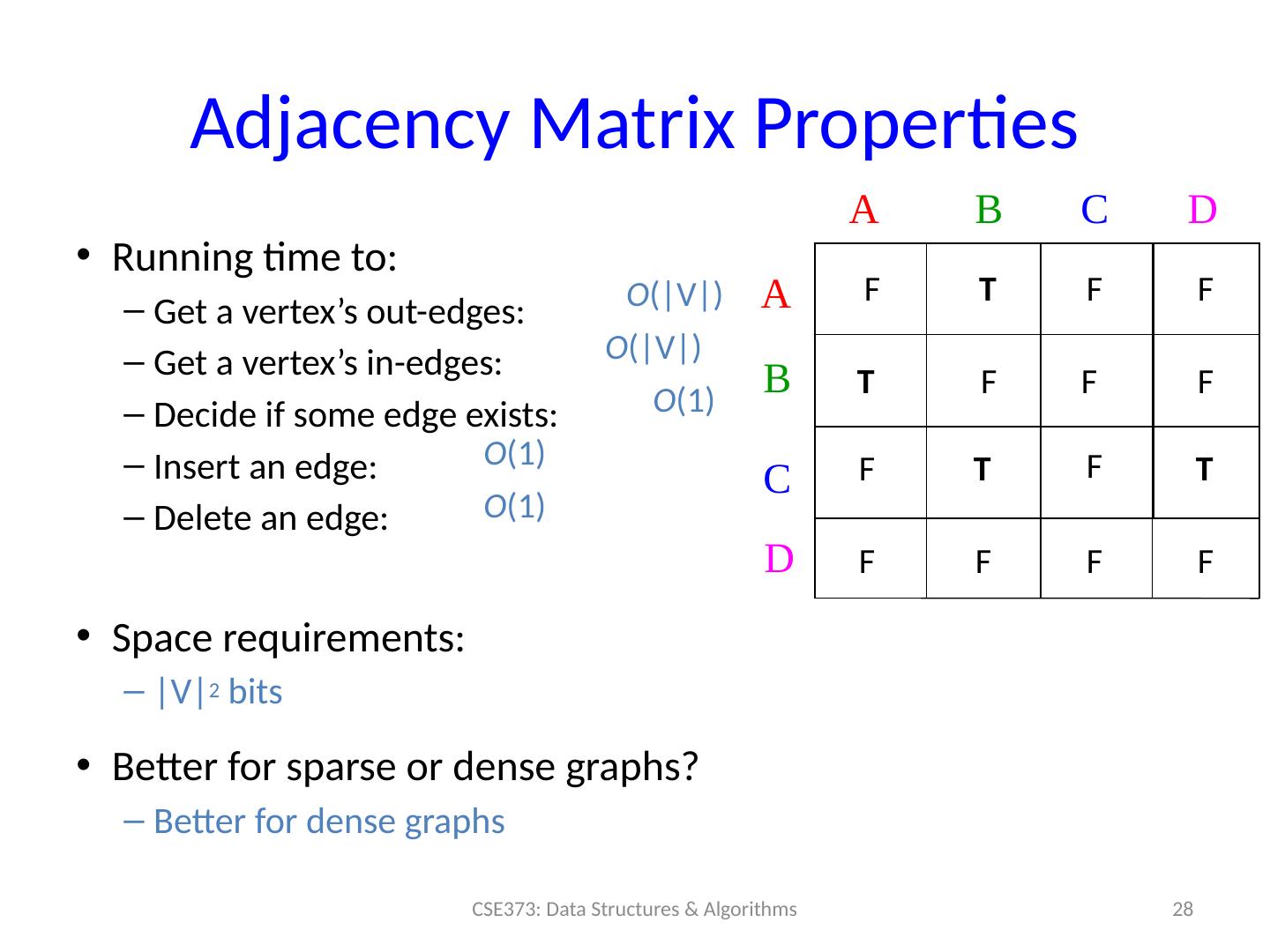 27 .Adjacency Matrix Assign each vertex/node a number from 0 to |V|-1 A |V| x |V| matrix (i.e., 2-D array) of Booleans (or 1 vs. 0) If M is the matrix, then M[u][v] being true means there is an edge from u to v 27 CSE373: Data Structures & Algorithms A B C A B C D D A B C D T T T T F F F F F F F F F F F F