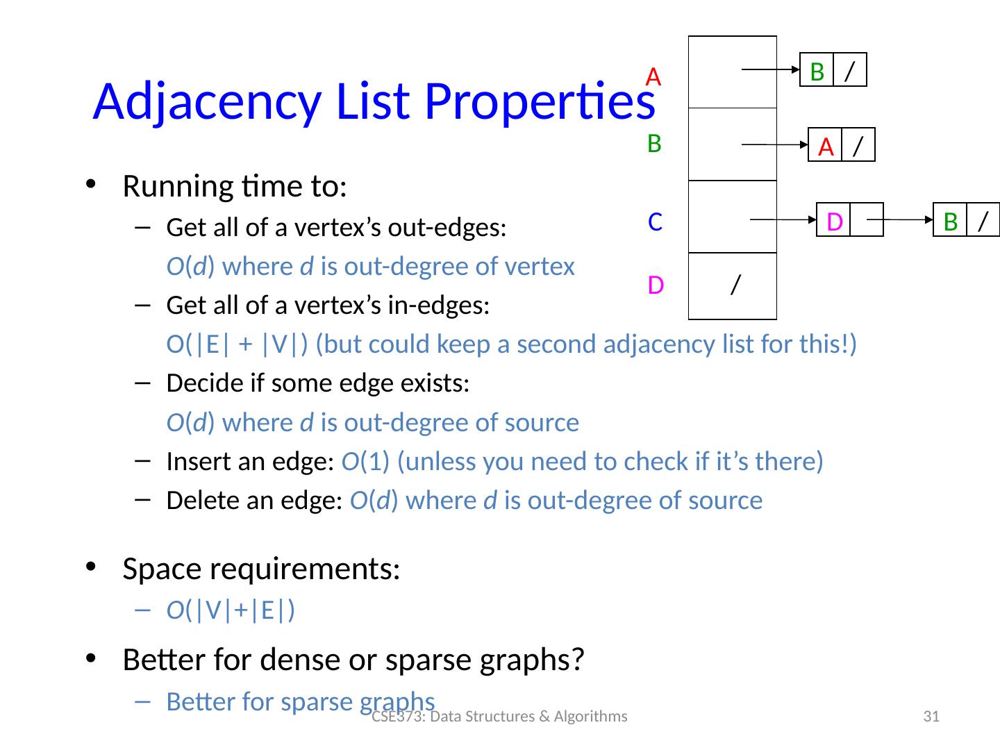 28 .Adjacency Matrix P roperties Running time to: Get a vertex’s out-edges: Get a vertex’s in-edges: Decide if some edge exists: Insert an edge: Delete an edge: Space requirements: |V| 2 bits Better for sparse or dense graphs? Better for dense graphs CSE373: Data Structures & Algorithms 28 A B C A B C D D T T T T F F F F F F F F F F F F O (|V| ) O (|V| ) O (1) O (1) O (1)