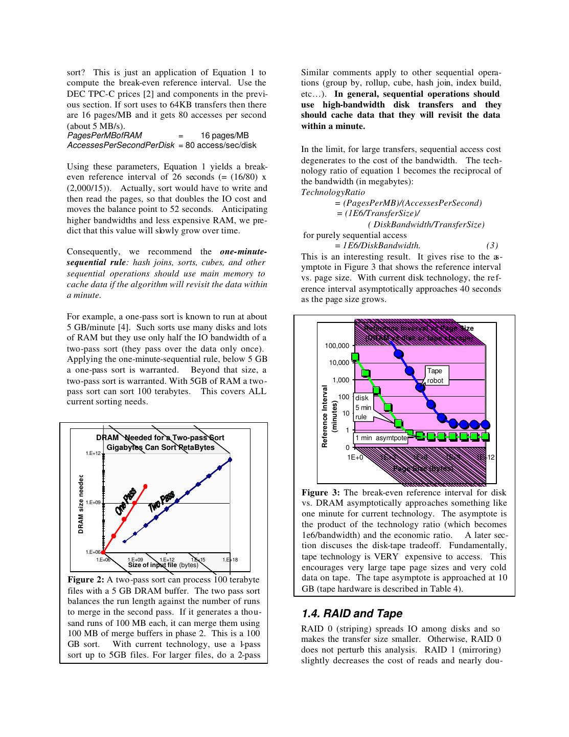 2 .Evaluating Equation 1 with these values gives a ref- 1.2. Sequential Data Access: the One-Minute erence interval of 266 seconds -- about five minutes1 . Sequential Rule So, even in 1997, data referenced every five minutes The discussion so far has focused on random access should be kept in main memory. to small (8KB) pages. Sequential access to large pages has different behavior. Modern disks can Prices for the same equipment vary enormously, but transfer data at 10 MBps if accessed sequentially all the categories we have examined follow some- (Figure 1a). That is a peak value, the analysis here thing like a five-minute rule. Server hardware prices uses a more realistic 5 MB/s as a disk sequential data are often three times higher than "street prices" for rate. Disk bandwidth drops 10x (to 0.5 MBps) if the the same components. DEC Polaris RAM is half the application fetches random 8KB pages from disk. price of DELL. Recent TPC-C Compaq reports have So, it should not be surprising that sequential IO op- 3x higher RAM prices (47$/MB) and 1.5x higher erations like sort, cube, and join, have different disk prices (3129$/drive) giving a two-minute rule. RAM/disk tradeoffs. As shown below, they follow a The March 1997 SUN+Oracle TPC-C benchmark [3] one-minute-sequential rule. had prices even better than DELL (13$/MB of RAM and 1690$ per 4GB disk and controllers). These sys- If a sequential operation reads data and never refer- tems all are near the five-minute rule. Mainframes ences it, then there is no need to cache the data in are at 130$/MB for RAM, 10K$/MIPS, and RAM. In such one-pass algorithms, the system needs 12k$/disk. Thus, mainframes follow a three-minute only enough buffer memory to allow data to stream rule. from disk to main memory. Typically, two or three one-track buffers (~100 KB) are adequate. For one- One can think of the first ratio of Equation 1 (Pages- pass sequential operations, less than a megabyte of PerMBofRAM/AccessesPerSecondPerDisk) as a RAM per disk is needed to buffer disk operations and technology ratio. The second ratio of Equation 1 allow the device to stream data to the application. (PriceofDiskDrive/PriceOfMBofRAM) is an eco- nomic ratio. Looking at the trend lines in Figure 1, Many sequential operations read a large data-set and the technology ratio is shifting. Page size has in - then revisit parts of the data. Database join, cube, creased with accesses/second so the technology ratio rollup, and sort operators all behave in this way. Con- has decreased ten fold (from 512/30 = 17 to 128/64 = sider the dis k access behavior of Sort in particular. 2). Disk drive prices dropped 10x and RAM prices Sort uses sequential data access and large disk trans- dropped 200x, so that the economic ratio has ni - fers to optimize disk utilization and bandwidth. Sort creased ten fold (20k$/2k$=10 to 2k$/15$=133). The ingests the input file, reorganizes the records in consequent reference interval of equation (1) went sorted order, and then sequentially writes the output from 170 seconds (17x10) to 266 seconds (2x133). file. If the sort cannot fit the file in main memory, it produces sorted runs in a first pass and then merges These calculations indicate that the reference in- these runs into a sorted file in the second pass. terval of Equation (1) is almost unchanged, despite Hash-join has a similar one-pass two-pass behavior. these 10x, 100x, and 1,000x changes. It is still in the 1-minute to 10-minute range. The 5-minute The memory demand of a two pass sort is approxi- rule still applies to randomly accessed pages. mately given in equation 2: MemoryForTwoPassSort The original paper [1] also described the 10-byte rule ? 6 ? Buffer _ Size ? 3 ? Buffer _ Size ? File _ Size.....( 2 ) for trading CPU instructions off against DRAM. At the time one instruction cost the same as 10 bytes. Equation 2 is derived as follows. The first sort pass Today, PCs follow a 1-byte rule, mini-computers produces about File_Size/Memory_Size runs while follow a 10 byte rule, while mainframes follow a the second pass can merge Memory_Size/Buffer_Size kilobyte rule because the processors are so over- runs. Equating these two values and solving for priced. memory size gives the square root term. The con- stants (3 and 6) depend on the particular sort algo- rithm. Equation 2 is graphed in Figure 2 for file sizes from megabytes to exabytes. 1 Sort shows a clear tradeoff of memory and disk IO. The current 2 KB page-size of Microsoft SQL Server 6.5 A one-pass sort uses half the disk IO but much more gives a reference interval of 20 minutes . MS SQL is memory. When is it appropriate to use a one-pass moving to an 8 KB page size in the 1998 release.