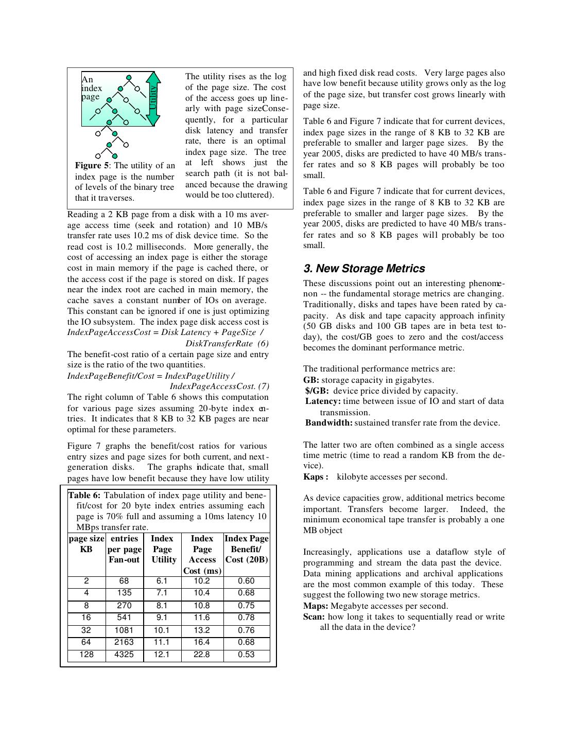 5 . The utility rises as the log and high fixed disk read costs. Very large pages also An have low benefit because utility grows only as the log index of the page size. The cost Utility page of the access goes up line- of the page size, but transfer cost grows linearly with arly with page sizeConse- page size. quently, for a particular Table 6 and Figure 7 indicate that for current devices, disk latency and transfer index page sizes in the range of 8 KB to 32 KB are rate, there is an optimal preferable to smaller and larger page sizes. By the index page size. The tree year 2005, disks are predicted to have 40 MB/s trans- Figure 5: The utility of an at left shows just the fer rates and so 8 KB pages will probably be too index page is the number search path (it is not bal- small. of levels of the binary tree anced because the drawing would be too cluttered). Table 6 and Figure 7 indicate that for current devices, that it traverses. index page sizes in the range of 8 KB to 32 KB are Reading a 2 KB page from a disk with a 10 ms aver- preferable to smaller and larger page sizes. By the age access time (seek and rotation) and 10 MB/s year 2005, disks are predicted to have 40 MB/s trans- transfer rate uses 10.2 ms of disk device time. So the fer rates and so 8 KB pages will probably be too read cost is 10.2 milliseconds. More generally, the small. cost of accessing an index page is either the storage cost in main memory if the page is cached there, or 3. New Storage Metrics the access cost if the page is stored on disk. If pages These discussions point out an interesting phenome- near the index root are cached in main memory, the non -- the fundamental storage metrics are changing. cache saves a constant number of IOs on average. Traditionally, disks and tapes have been rated by ca- This constant can be ignored if one is just optimizing pacity. As disk and tape capacity approach infinity the IO subsystem. The index page disk access cost is (50 GB disks and 100 GB tapes are in beta test to- IndexPageAccessCost = Disk Latency + PageSize / day), the cost/GB goes to zero and the cost/access DiskTransferRate (6) becomes the dominant performance metric. The benefit-cost ratio of a certain page size and entry size is the ratio of the two quantities. The traditional performance metrics are: IndexPageBenefit/Cost = IndexPageUtility / GB: storage capacity in gigabytes. IndexPageAccessCost. (7) $/GB: device price divided by capacity. The right column of Table 6 shows this computation Latency: time between issue of IO and start of data for various page sizes assuming 20-byte index en- transmission. tries. It indicates that 8 KB to 32 KB pages are near Bandwidth: sustained transfer rate from the device. optimal for these parameters. Figure 7 graphs the benefit/cost ratios for various The latter two are often combined as a single access entry sizes and page sizes for both current, and next - time metric (time to read a random KB from the de- generation disks. The graphs indicate that, small vice). pages have low benefit because they have low utility Kaps : kilobyte accesses per second. Table 6: Tabulation of index page utility and bene- As device capacities grow, additional metrics become fit/cost for 20 byte index entries assuming each important. Transfers become larger. Indeed, the page is 70% full and assuming a 10ms latency 10 minimum economical tape transfer is probably a one MBps transfer rate. MB object page size entries Index Index Index Page KB per page Page Page Benefit/ Increasingly, applications use a dataflow style of Fan-out Utility Access Cost (20B) programming and stream the data past the device. Cost (ms) Data mining applications and archival applications 2 68 6.1 10.2 0.60 are the most common example of this today. These 4 135 7.1 10.4 0.68 suggest the following two new storage metrics. 8 270 8.1 10.8 0.75 Maps: Megabyte accesses per second. 16 541 9.1 11.6 0.78 Scan: how long it takes to sequentially read or write 32 1081 10.1 13.2 0.76 all the data in the device? 64 2163 11.1 16.4 0.68 128 4325 12.1 22.8 0.53
