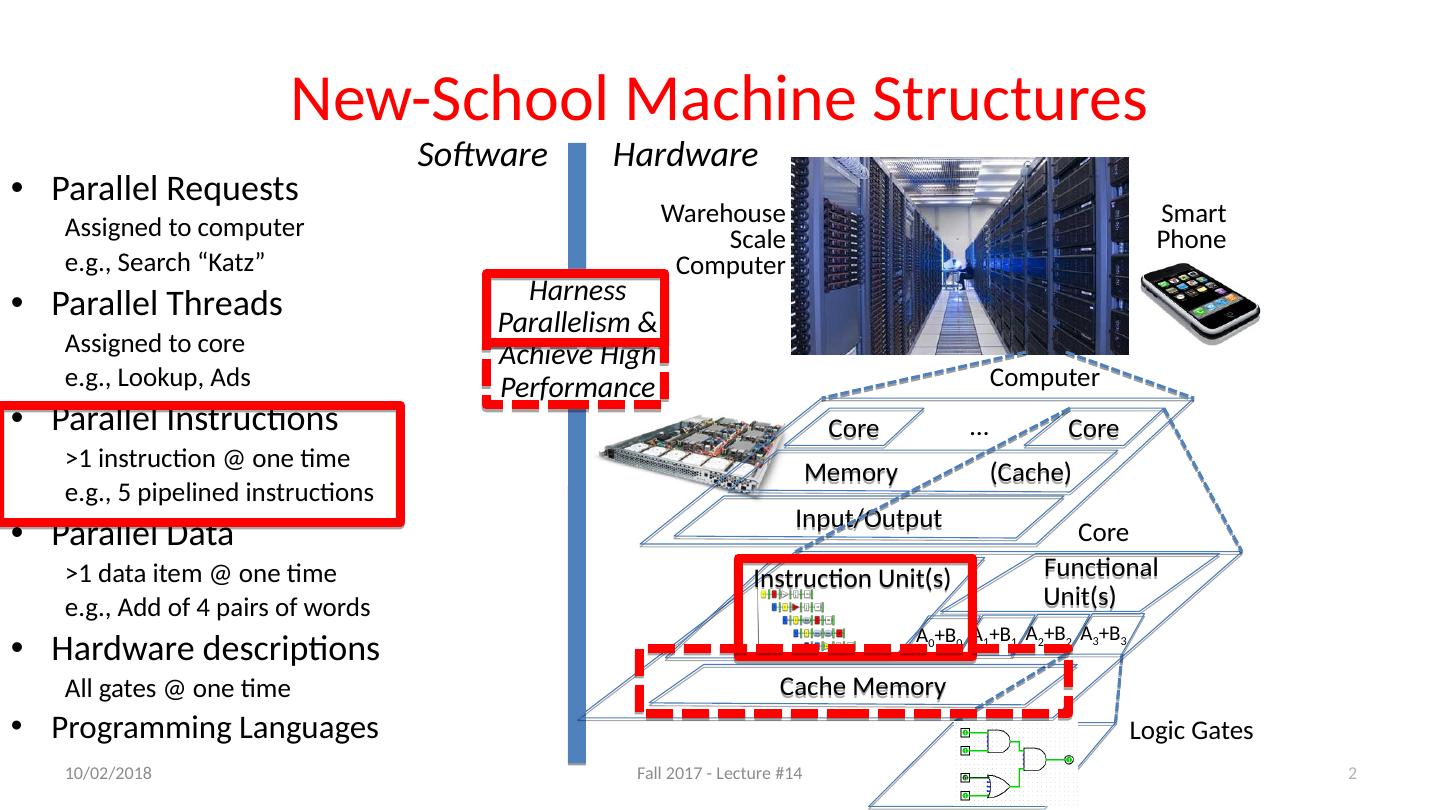 2 .New-School Machine Structures 2 Parallel Requests Assigned to computer e.g., Search “Katz” Parallel Threads Assigned to core e.g., Lookup, Ads Parallel Instructions >1 instruction @ one time e.g., 5 pipelined instructions Parallel Data >1 data item @ one time e.g., Add of 4 pairs of words Hardware descriptions All gates @ one time Programming Languages Smart Phone Warehouse Scale Computer Software Hardware Harness Parallelism & Achieve High Performance Logic Gates Core Core … Memory (Cache) Input/Output Computer Cache Memory Core Instruction Unit(s ) Functional Unit(s ) A 3 +B 3 A 2 +B 2 A 1 +B 1 A 0 +B 0 10/11/17 Fall 2017 - Lecture #14