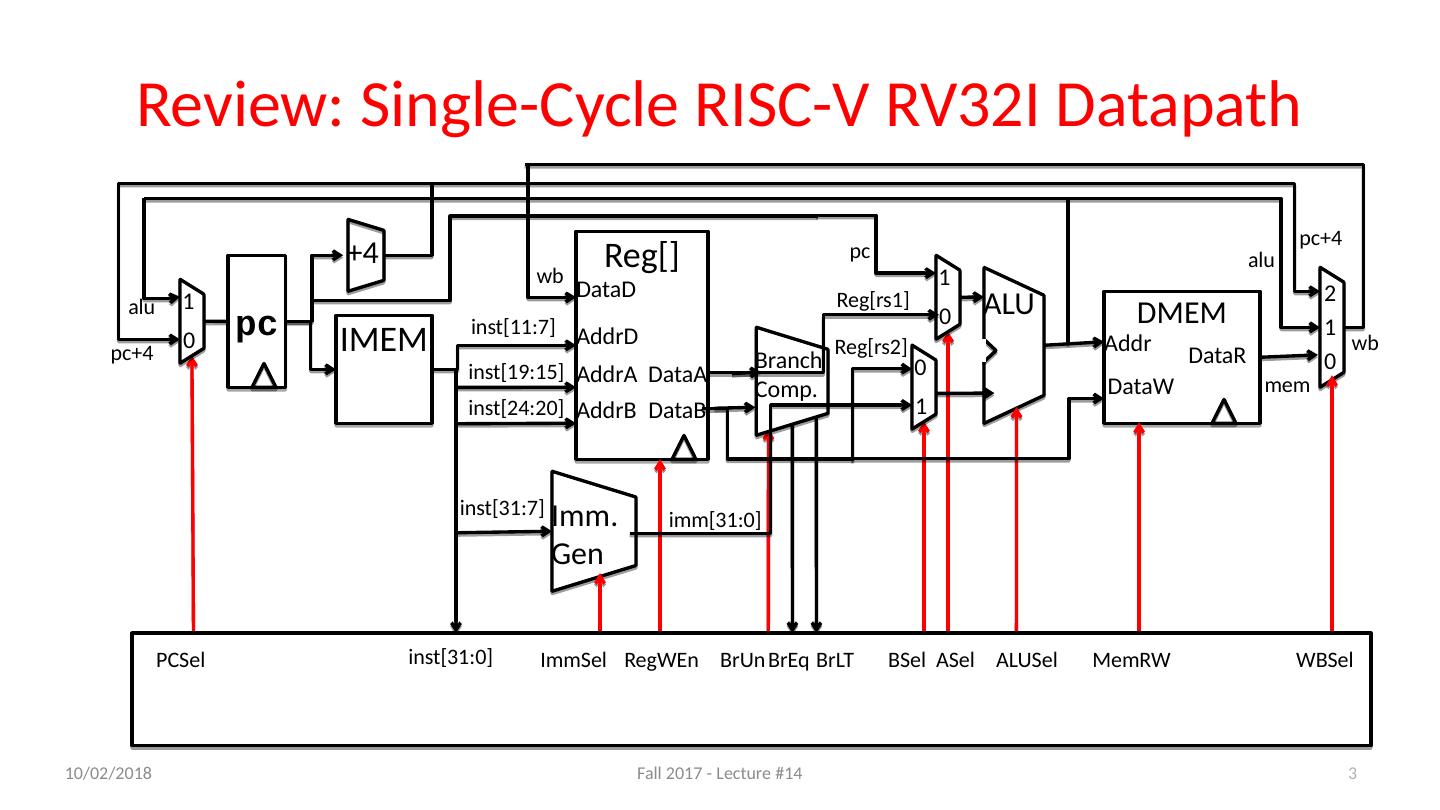 3 .Review: Single-Cycle RISC-V RV32I Datapath IMEM ALU Imm . Gen +4 DMEM Branch Comp. Reg [] AddrA AddrB DataA AddrD DataB DataD Addr DataW DataR 1 0 0 1 2 1 0 pc 0 1 inst [11:7] inst [19:15] inst [24:20] inst [31:7] pc+4 alu mem wb alu pc+4 Reg [rs1] pc imm [31:0] Reg [rs2] inst [31:0] ImmSel RegWEn BrUn BrEq BrLT ASel BSel ALUSel MemRW WBSel PCSel wb 3 10/11/17 Fall 2017 - Lecture #14