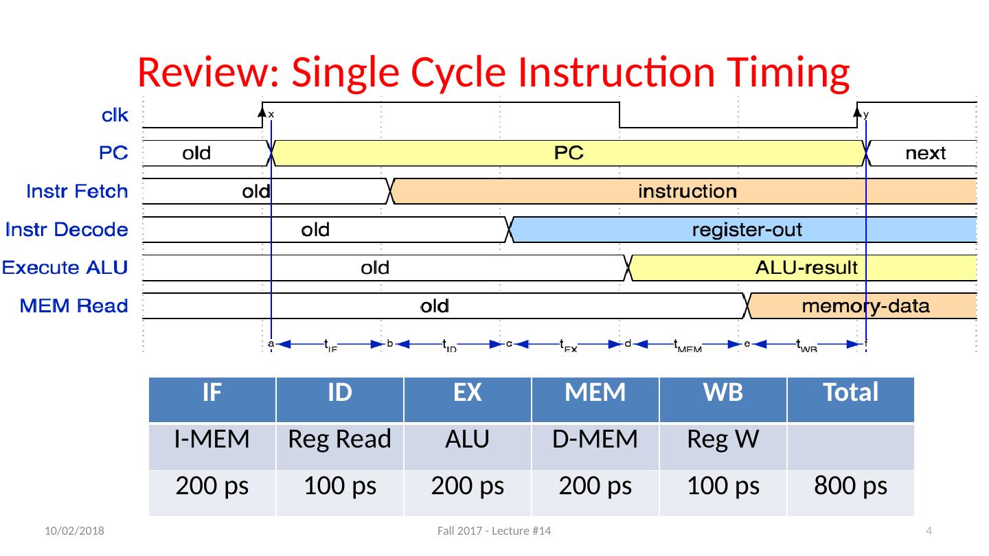4 .Review: Single Cycle Instruction Timing IF ID EX MEM WB Total I-MEM Reg Read ALU D-MEM Reg W 200 ps 100 ps 200 ps 200 ps 100 ps 800 ps 4 10/11/17 Fall 2017 - Lecture #14