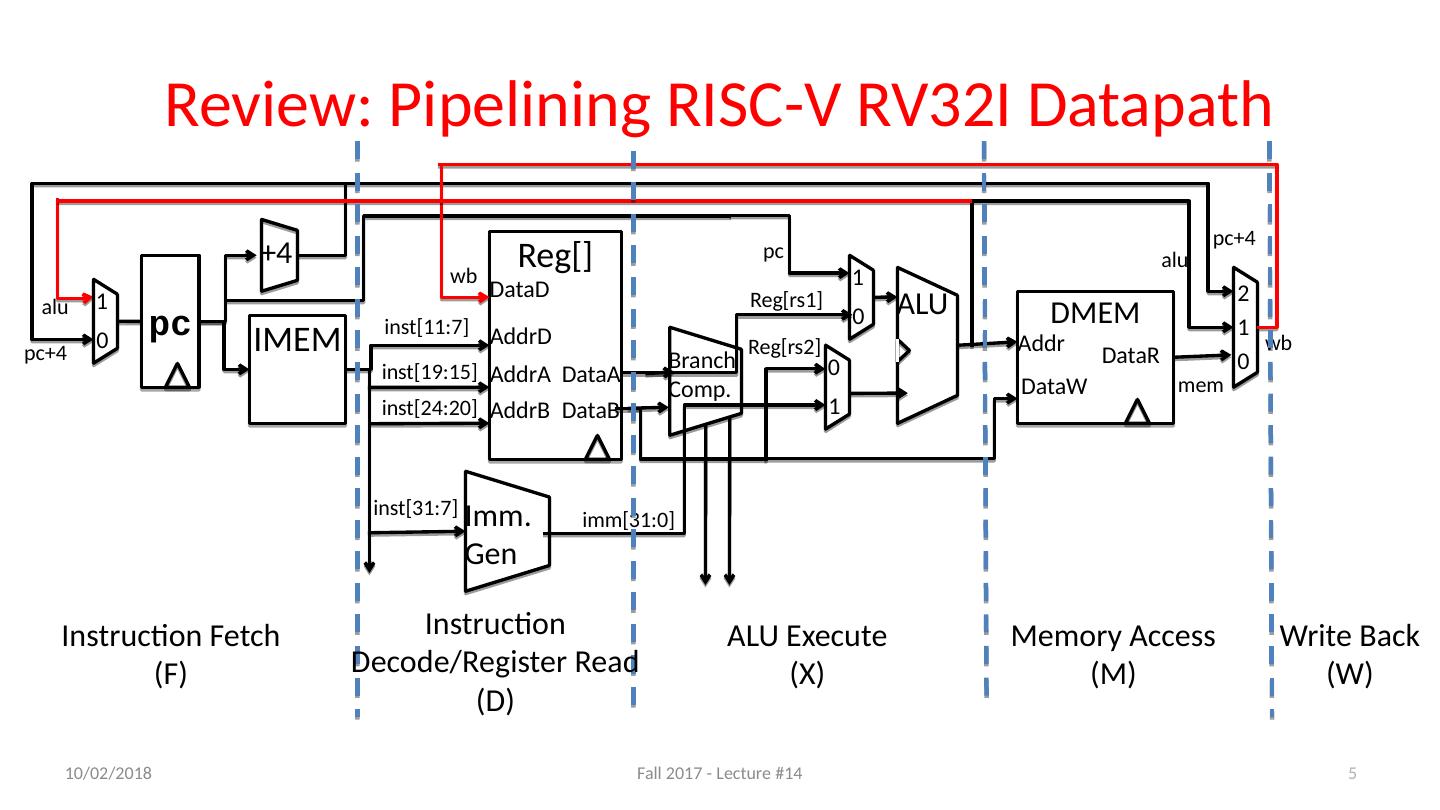 5 .Review: Pipelining RISC-V RV32I Datapath IMEM ALU Imm . Gen +4 DMEM Branch Comp. Reg [] AddrA AddrB DataA AddrD DataB DataD Addr DataW DataR 1 0 0 1 2 1 0 pc 0 1 inst [11:7] inst [19:15] inst [24:20] inst [31:7] pc+4 alu mem wb alu pc+4 Reg [rs1] pc imm [31:0] Reg [rs2] wb Instruction Fetch (F) Instruction Decode/Register Read (D) ALU Execute (X) Memory Access (M) Write Back (W) 5 10/11/17 Fall 2017 - Lecture #14