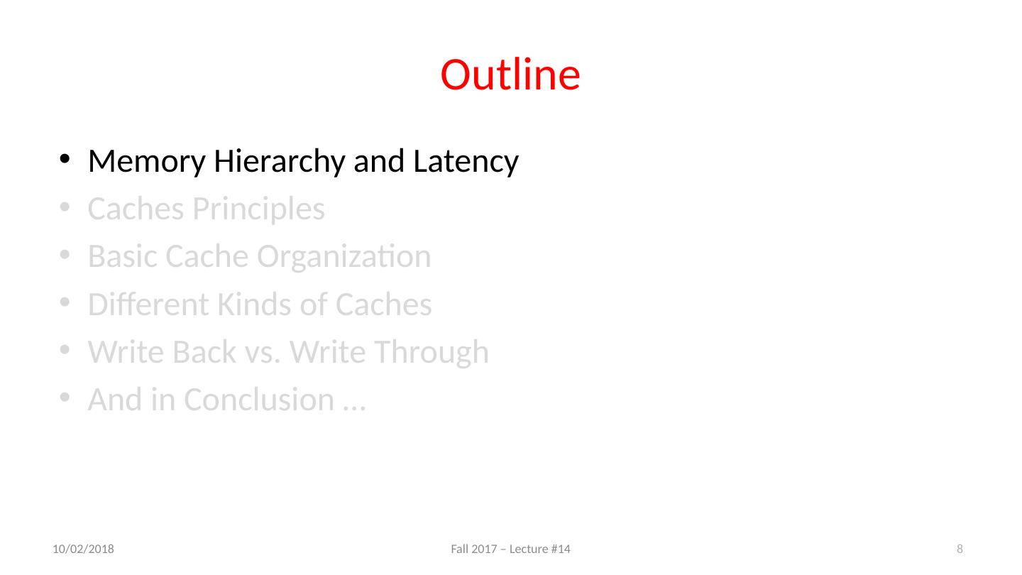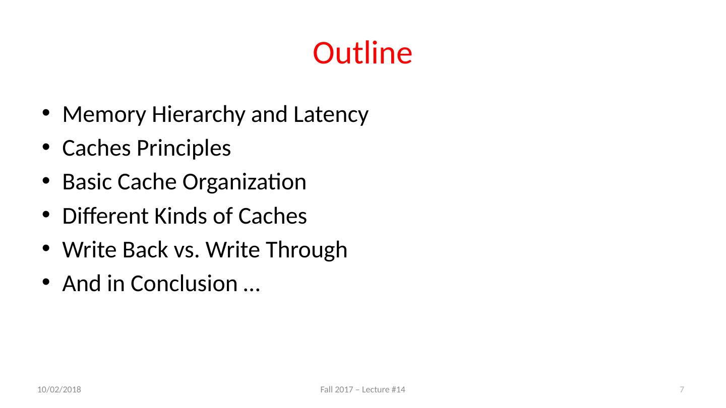 7 .Outline Memory Hierarchy and Latency Caches Principles Basic Cache Organization Different Kinds of Caches Write Back vs. Write Through And in Conclusion … 7 10/11/17 Fall 2017 – Lecture #14