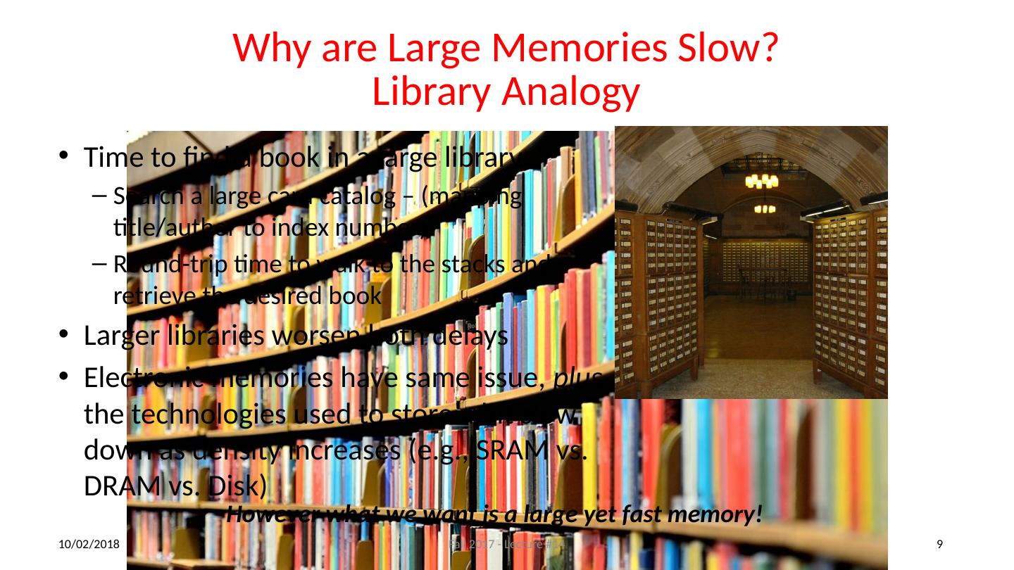 9 .Why are Large Memories Slow? Library Analogy Time to find a book in a large library S earch a large card catalog – (mapping title/author to index number) Round-trip time to walk to the stacks and retrieve the desired book Larger libraries worsen both delays Electronic memories have same issue, plus the technologies used to store a bit slow down as density increases (e.g., SRAM vs. DRAM vs. Disk) However what we want is a large yet fast memory! 10/11/17 Fall 2017 - Lecture #14 9