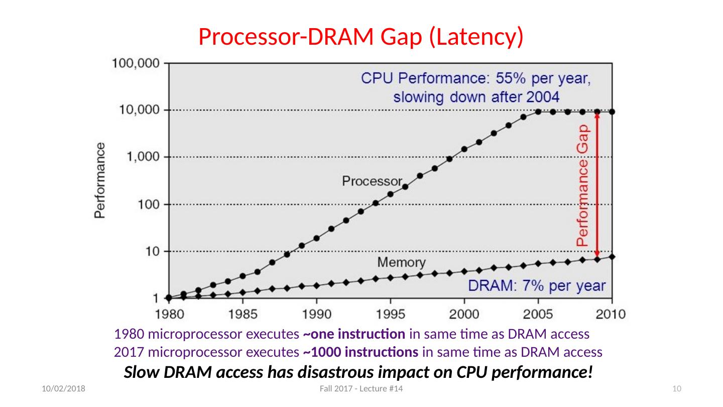 10 .Processor-DRAM Gap (Latency) 1980 microprocessor executes ~one instruction in same time as DRAM access 2017 microprocessor executes ~1000 instructions in same time as DRAM access Slow DRAM access has disastrous impact on CPU performance! 10/11/17 Fall 2017 - Lecture #14 10