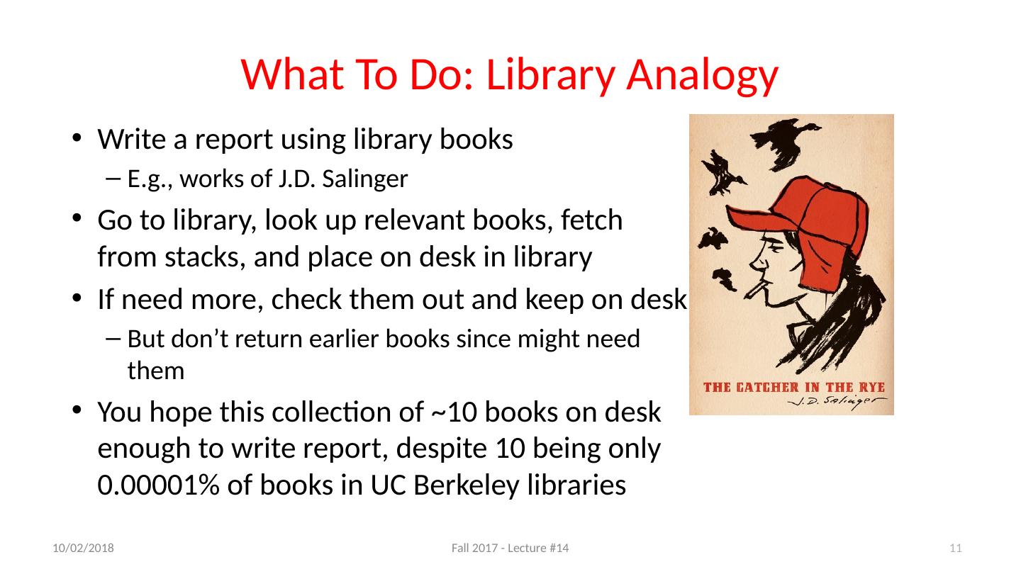 11 .What To Do: Library Analogy Write a report using library books E.g., works of J.D. Salinger Go to library, look up relevant books, fetch from stacks, and place on desk in library If need more, check them out and keep on desk But don’t return earlier books since might need them You hope this collection of ~10 books on desk enough to write report, despite 10 being only 0.00001% of books in UC Berkeley libraries 10/11/17 Fall 2017 - Lecture #14 11