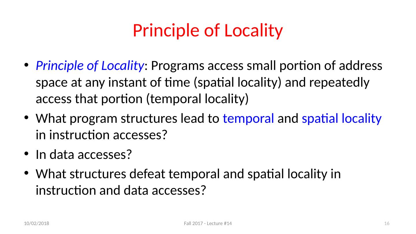 16 .Principle of Locality Principle of Locality : Programs access small portion of address space at any instant of time (spatial locality) and repeatedly access that portion (temporal locality) What program structures lead to temporal and spatial locality in instruction accesses? In data accesses? What structures defeat temporal and spatial locality in instruction and data accesses? 10/11/17 Fall 2017 - Lecture #14 16