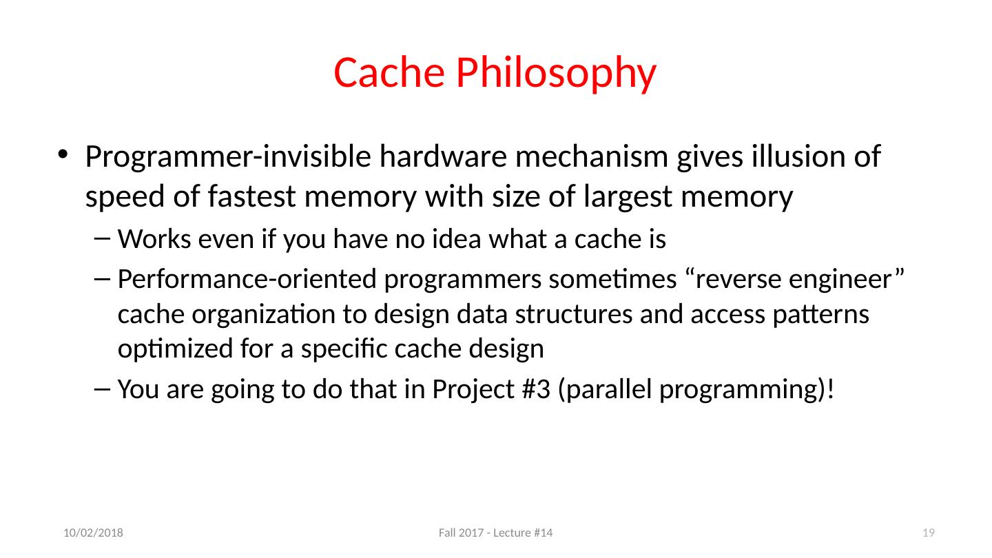 19 .Cache Philosophy Programmer-invisible hardware mechanism gives illusion of speed of fastest memory with size of largest memory Works even if you have no idea what a cache is P erformance-oriented programmers sometimes “reverse engineer” cache organization to design data structures and access patterns optimized for a specific cache design You are going to do that in Project #3 (parallel programming)! 19 10/11/17 Fall 2017 - Lecture #14