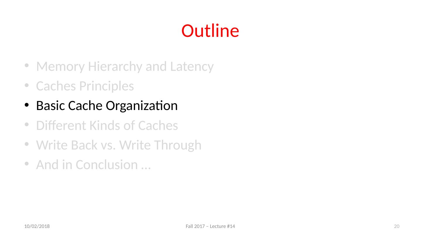 20 .Outline Memory Hierarchy and Latency Caches Principles Basic Cache Organization Different Kinds of Caches Write Back vs. Write Through And in Conclusion … 10/11/17 Fall 2017 – Lecture #14 20