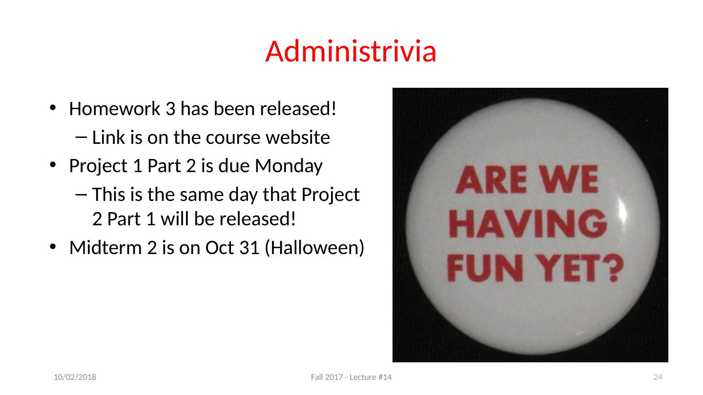 24 .Administrivia Homework 3 has been released! Link is on the course website Project 1 Part 2 is due Monday This is the same day that Project 2 Part 1 will be released! Midterm 2 is on Oct 31 (Halloween) 24 10/11/17 Fall 2017 - Lecture #14