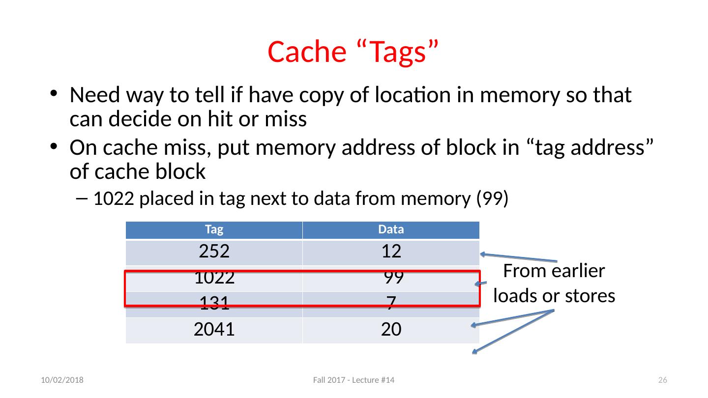 26 .Cache “Tags” Need way to tell if have copy of location in memory so that can decide on hit or miss On cache miss, put memory address of block in “tag address” of cache block 1022 placed in tag next to data from memory (99) Tag Data 252 12 1022 99 131 7 2041 20 From earlier loads or stores 10/11/17 Fall 2017 - Lecture #14 26