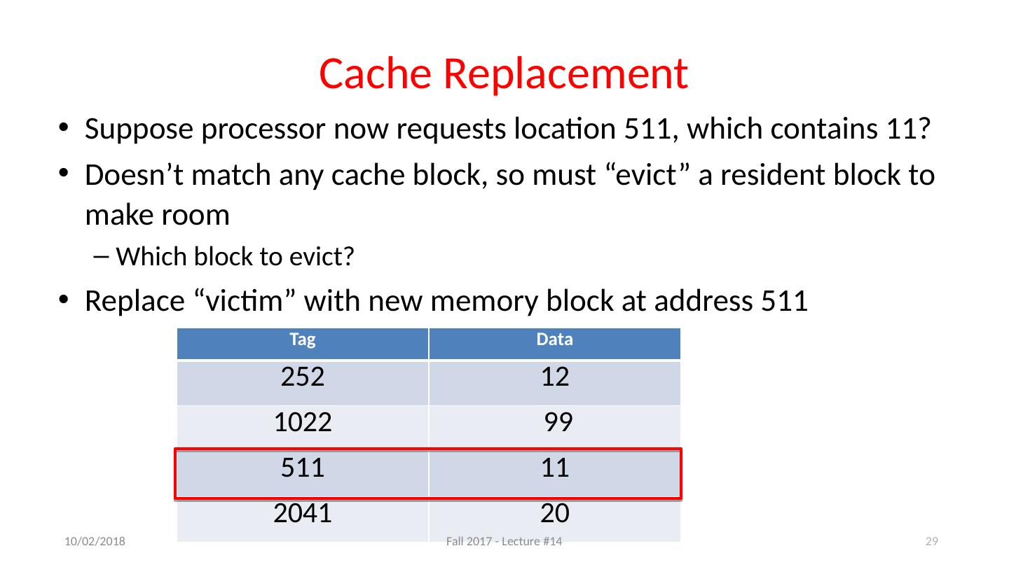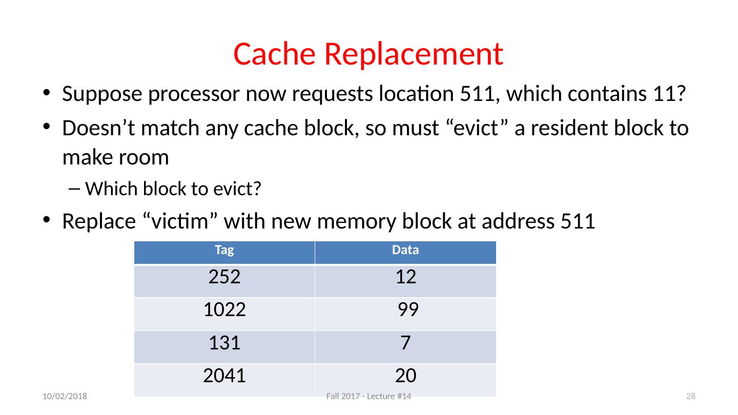 28 .Tag Data 252 12 1022 99 131 7 2041 20 Cache Replacement Suppose processor now requests location 511, which contains 11? Doesn’t match any cache block, so must “evict” a resident block to make room Which block to evict? Replace “victim” with new memory block at address 511 10/11/17 Fall 2017 - Lecture #14 28