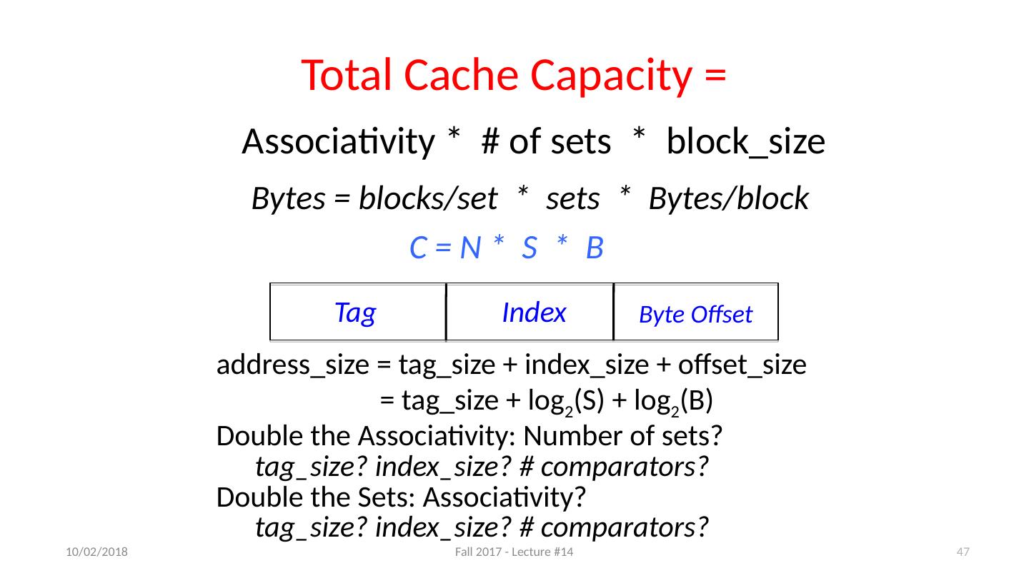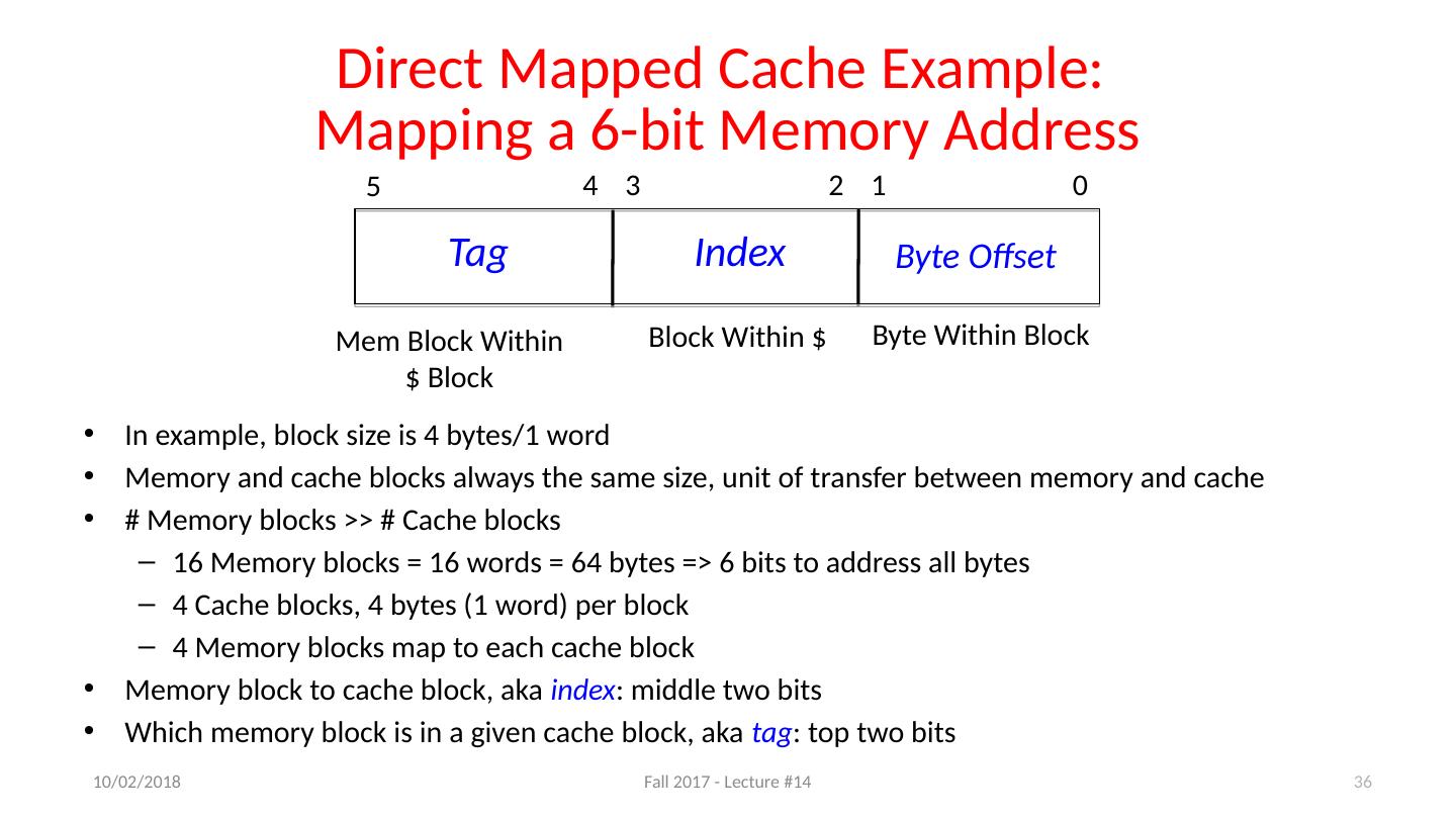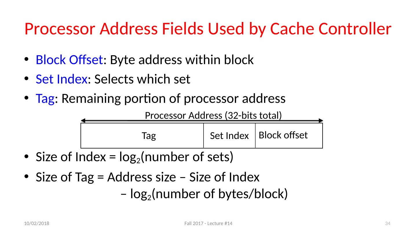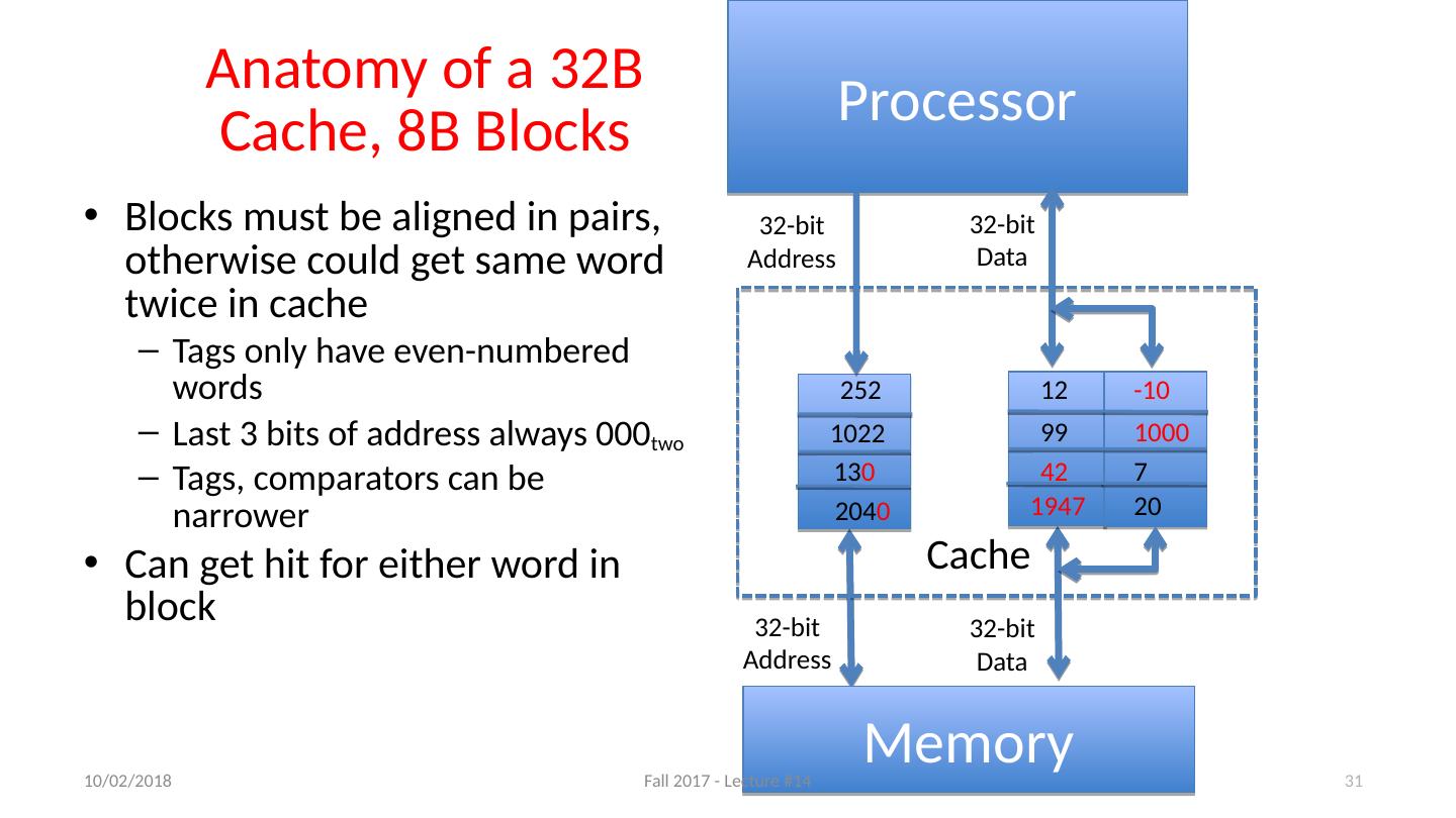 27 .Anatomy of a 16 Byte Cache, with 4 Byte Blocks Operations: Cache Hit Cache Miss Refill cache from memory Cache needs Address Tags to decide if Processor Address is a Cache Hit or Cache Miss Compares all four tags Processor 32-bit Address 32-bit Data Cache 32-bit Address 32-bit Data Memory 1022 99 252 7 20 12 131 2041 10/11/17 Fall 2017 - Lecture #14 27 27