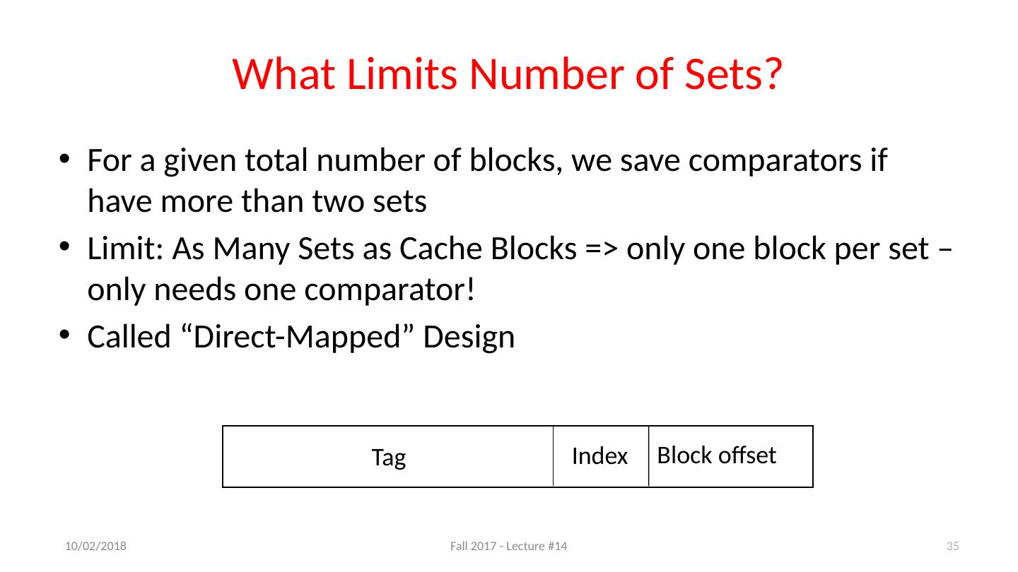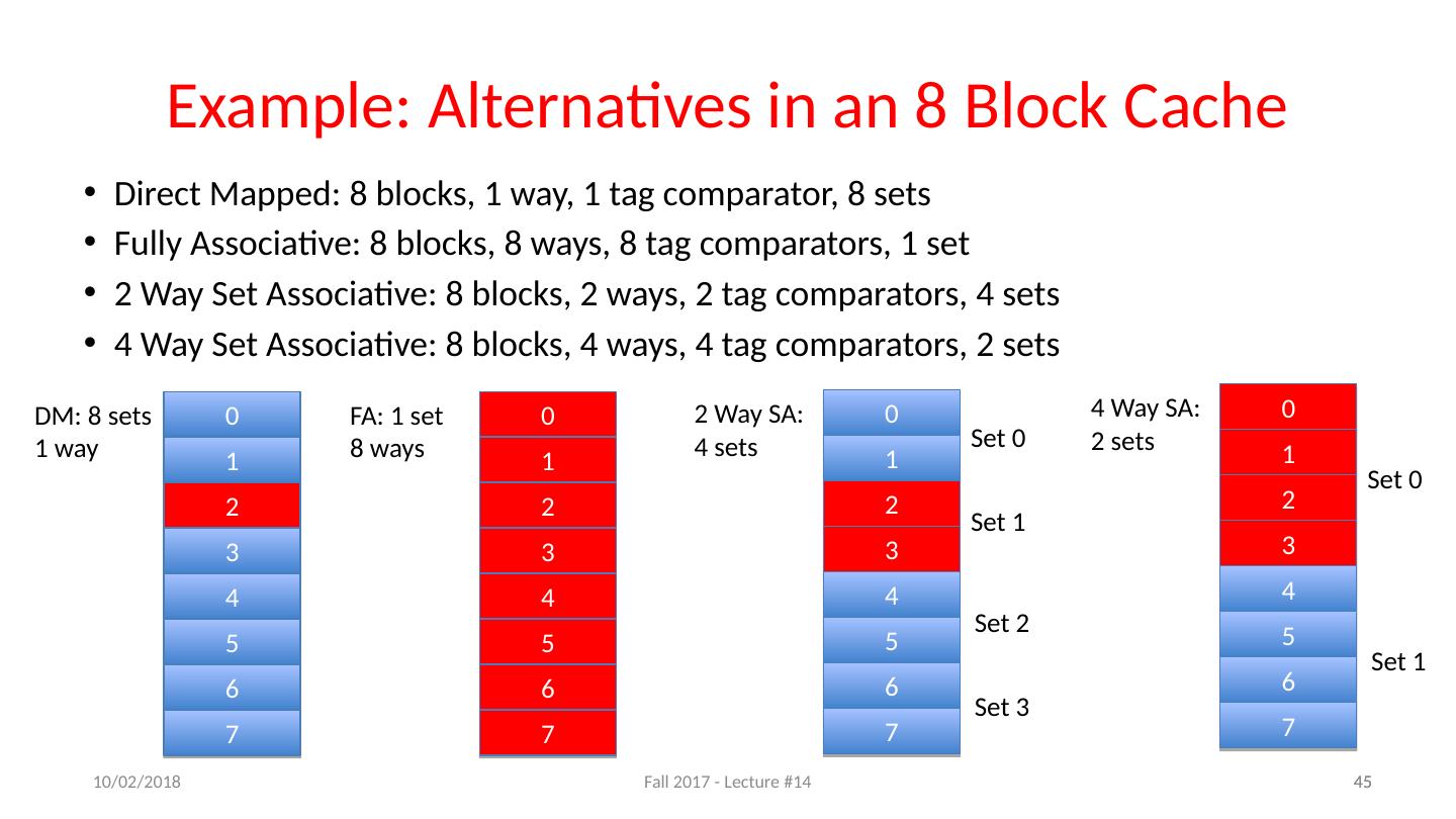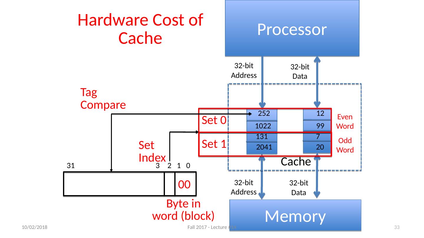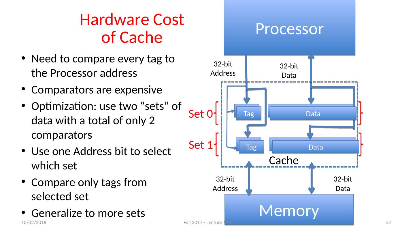 27 .Anatomy of a 16 Byte Cache, with 4 Byte Blocks Operations: Cache Hit Cache Miss Refill cache from memory Cache needs Address Tags to decide if Processor Address is a Cache Hit or Cache Miss Compares all four tags Processor 32-bit Address 32-bit Data Cache 32-bit Address 32-bit Data Memory 1022 99 252 7 20 12 131 2041 10/11/17 Fall 2017 - Lecture #14 27 27